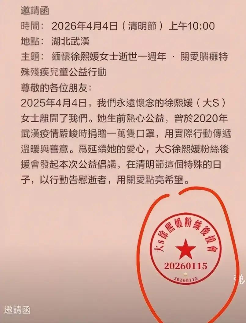 但這個愛心公益互動,到底是不是真的呢?雖然發起者做了一個像模像樣的邀請函,甚至還有大S徐熙媛粉絲後援會的印章,但這一切又能說明什麼呢?
