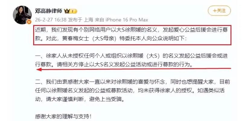 這次公益活動的發起,S家的人毫不知情。於是S媽委託律師鄧高靜維權,希望粉絲們認真辨別,不要被“有心人”利用了。