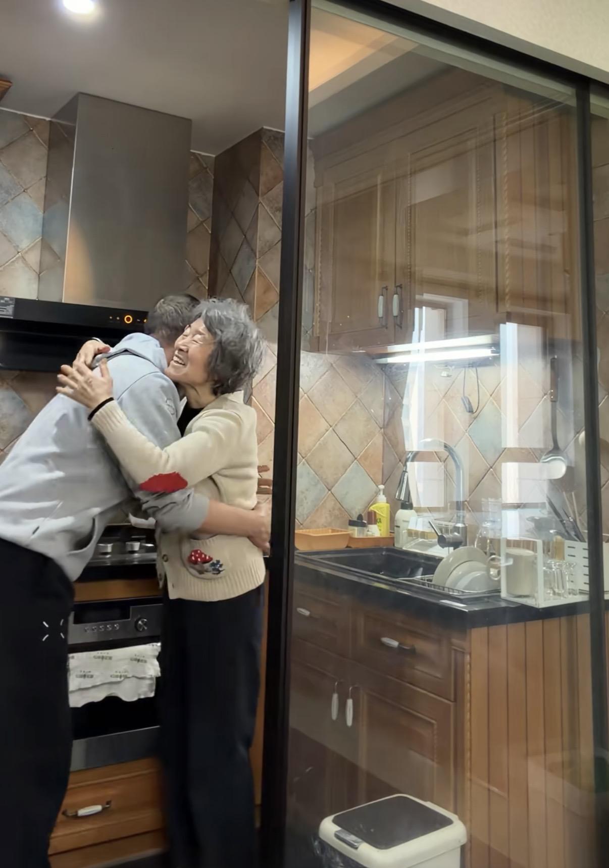 李亞鵬走到廚房,說要給老孃一件禮物,這件禮物就是來自兒子的擁抱,李亞鵬媽媽開心的伸出雙手,和兒子擁抱在一起,這個畫面太溫暖了。這個年紀、還有老母親的擁抱,真是幸福。