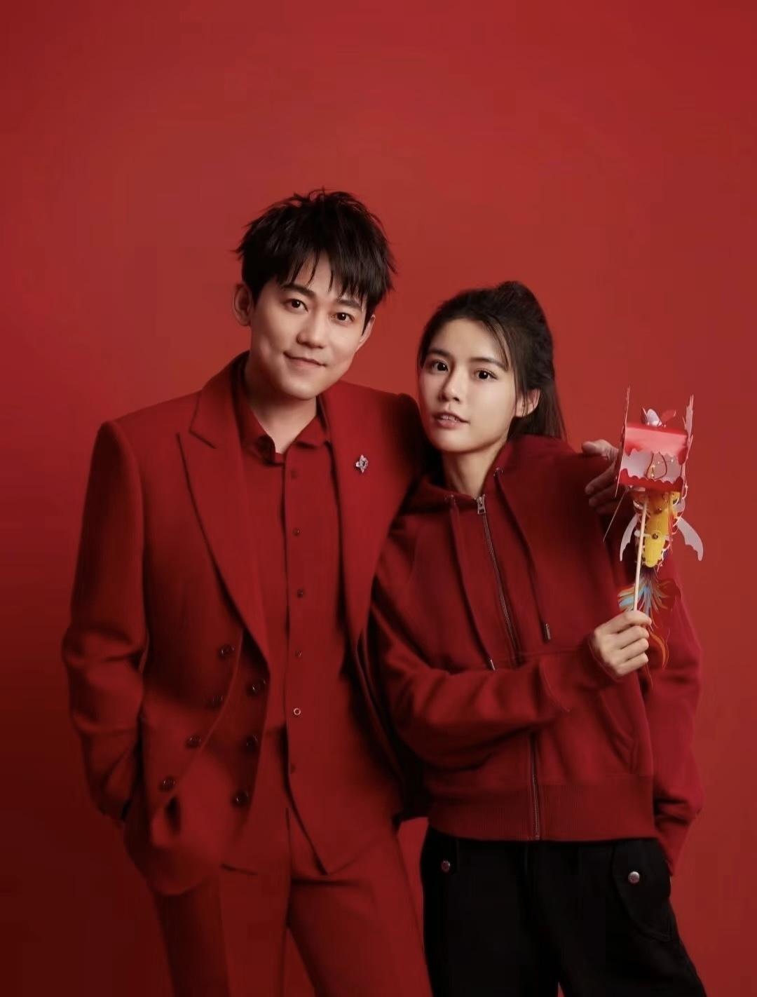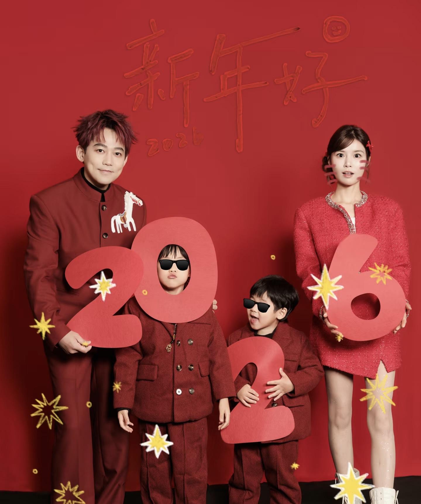 春節的時候,他們一家人還拍了寫真。甦醒和倆兒子都穿深紅色套裝,廖雨辰穿水紅色小香風套裙,她的模樣更顯年輕稚嫩,