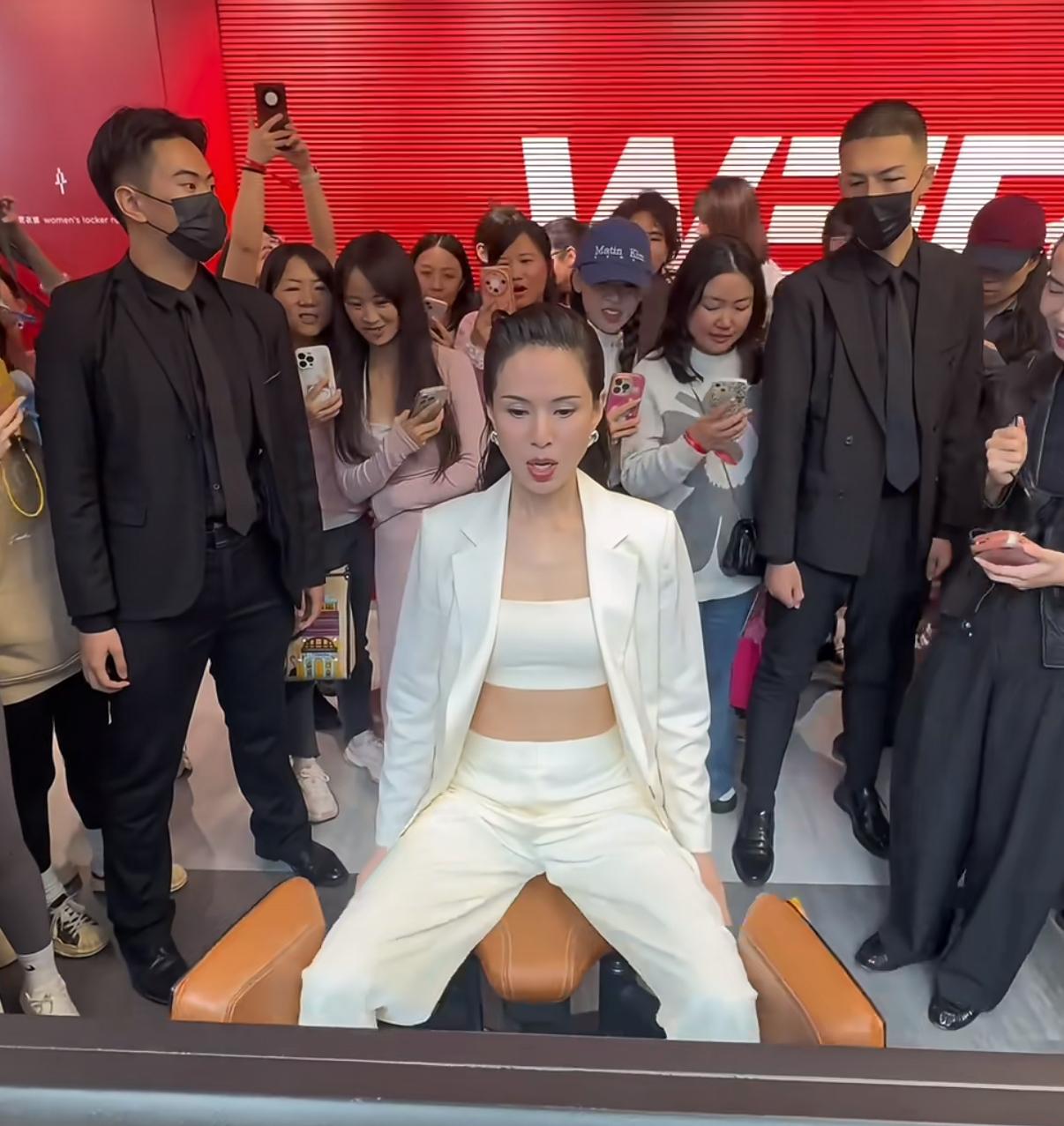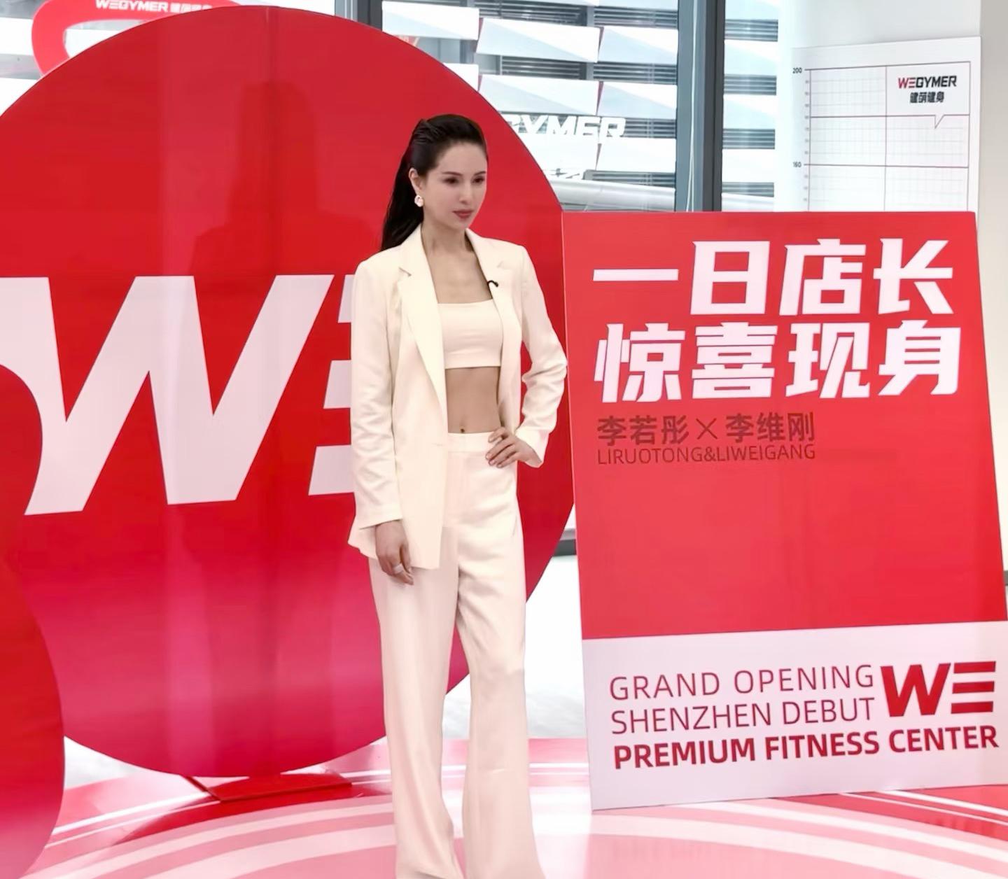 在健身房開業當天,李若彤現身站臺。她一身白色穿搭特別清爽,高高紮起來的馬尾顯得她很年輕,這狀態最多像四十出頭。