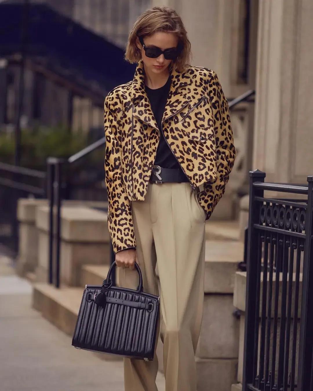 追求個性酷颯感的,可以試試豹紋元素,這麼一件短豹紋大衣外套,穿起來可不僅僅是酷颯個性那麼簡單,還更顯高挑感。對於個矮身材來說,能輕鬆打造出高挑感。搭配西裝闊腿褲,帥氣利落,日常出街回頭率很高。