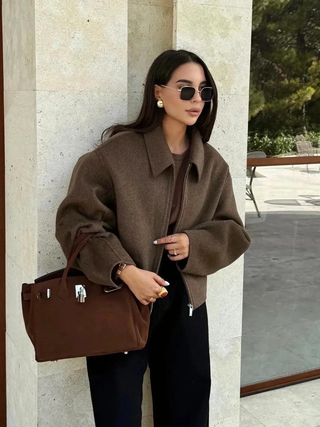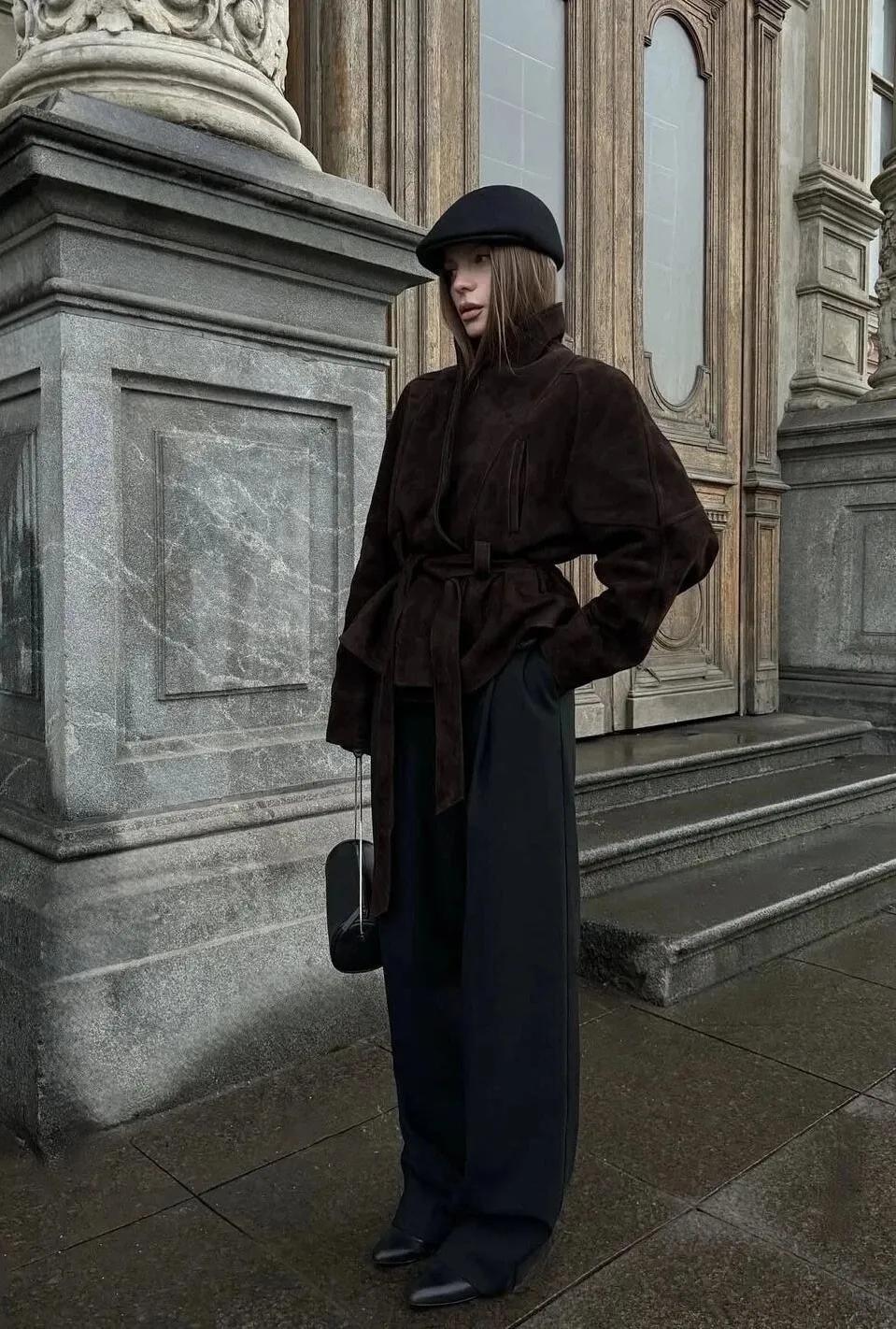 今年復古風依舊很流行,偏愛復古摩登風格的,可以換成這種焦糖色的款式,繫腰帶的設計,加上利落的立領,輕鬆穿出瘦身效果。搭配黑色闊腿褲,隨性又顯瘦,腳下踩着一雙黑色尖頭短靴,再拎着一個黑色包包,復古與摩登的結合。