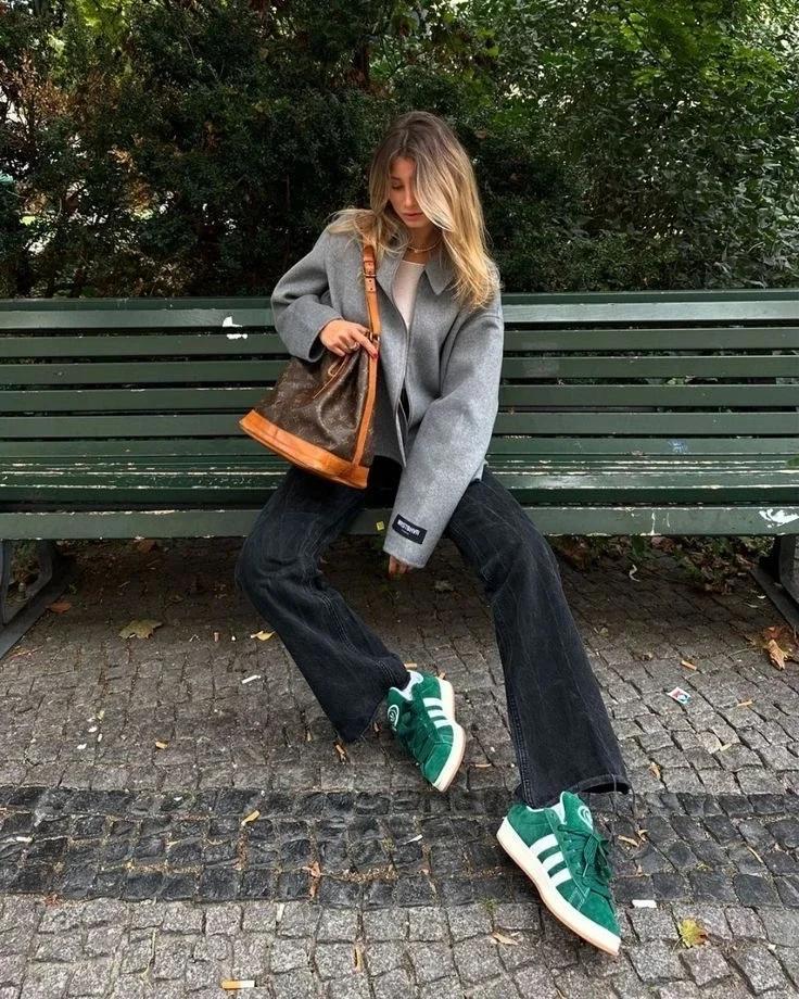 闊腿褲的寬鬆,是對腿型的無限包容,當配合上九分的長度,則多了幾分利落和帥氣。也可以選擇拖地褲,那樣的話造型就顯得很慵懶隨性了,灰色短大衣+牛仔闊腿褲,再配上一雙綠色的板鞋,日常休閒又舒適。