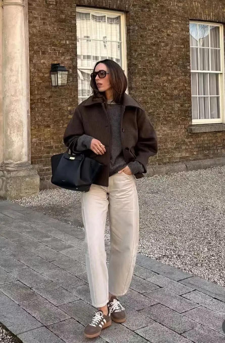 誰說深棕色這個顏色只適合秋冬季節呢,早春也合適,大翻領的設計,顯得利落又不失復古的調調。內搭深灰色針織衫,下身一條白色闊腿褲,修身腿型又耐看。腳下可以再穿上一雙棕色德訓鞋,復古舒適自在,日常出街回頭率很高的。