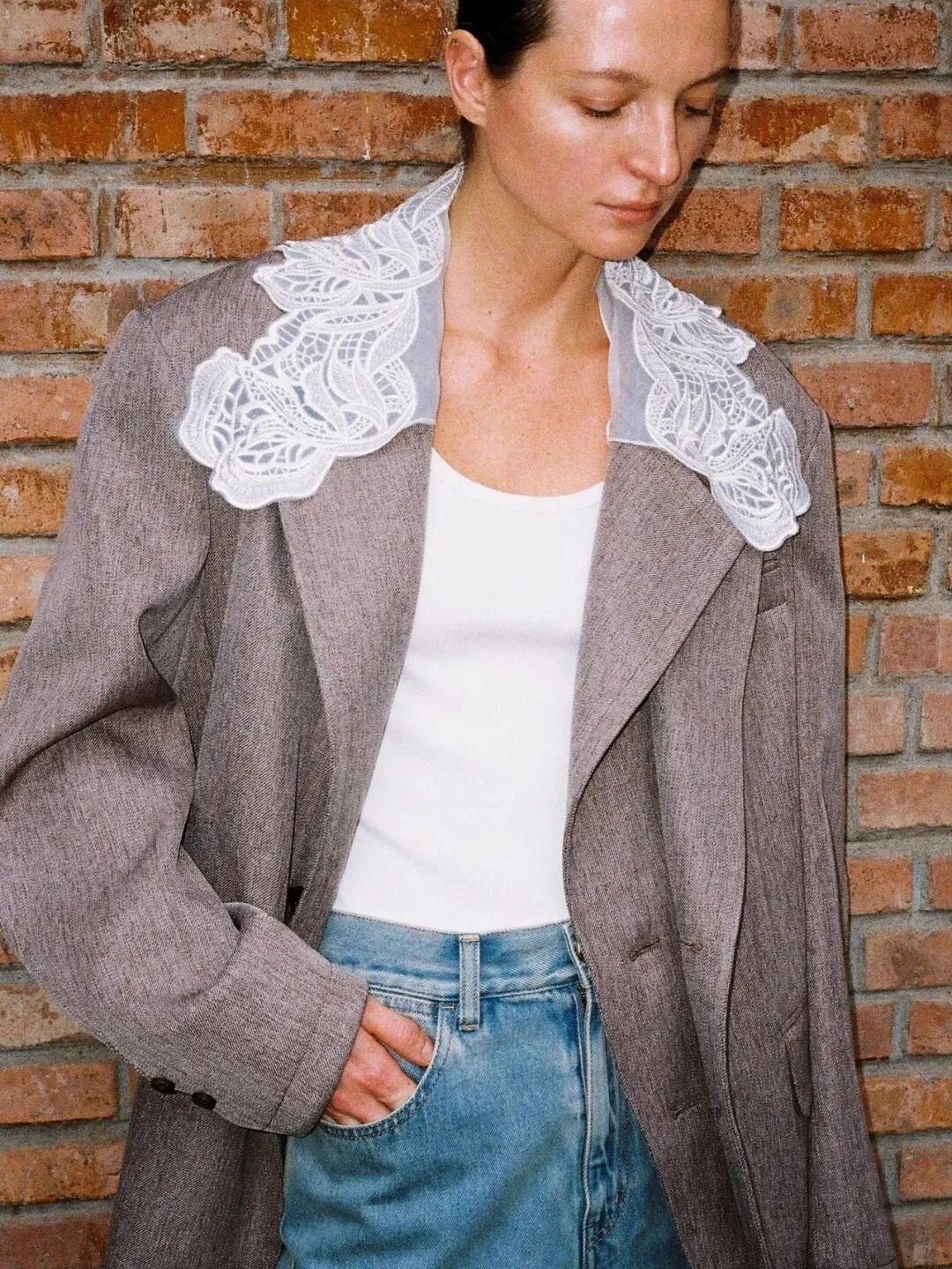 當然也不止西裝。這件26春夏的就比較日常,版型很寬鬆,下襬故意留了點毛邊,袖口有個小開衩,肩膀加了薄薄的墊肩,撐得起廓形但又不會太正式。▼