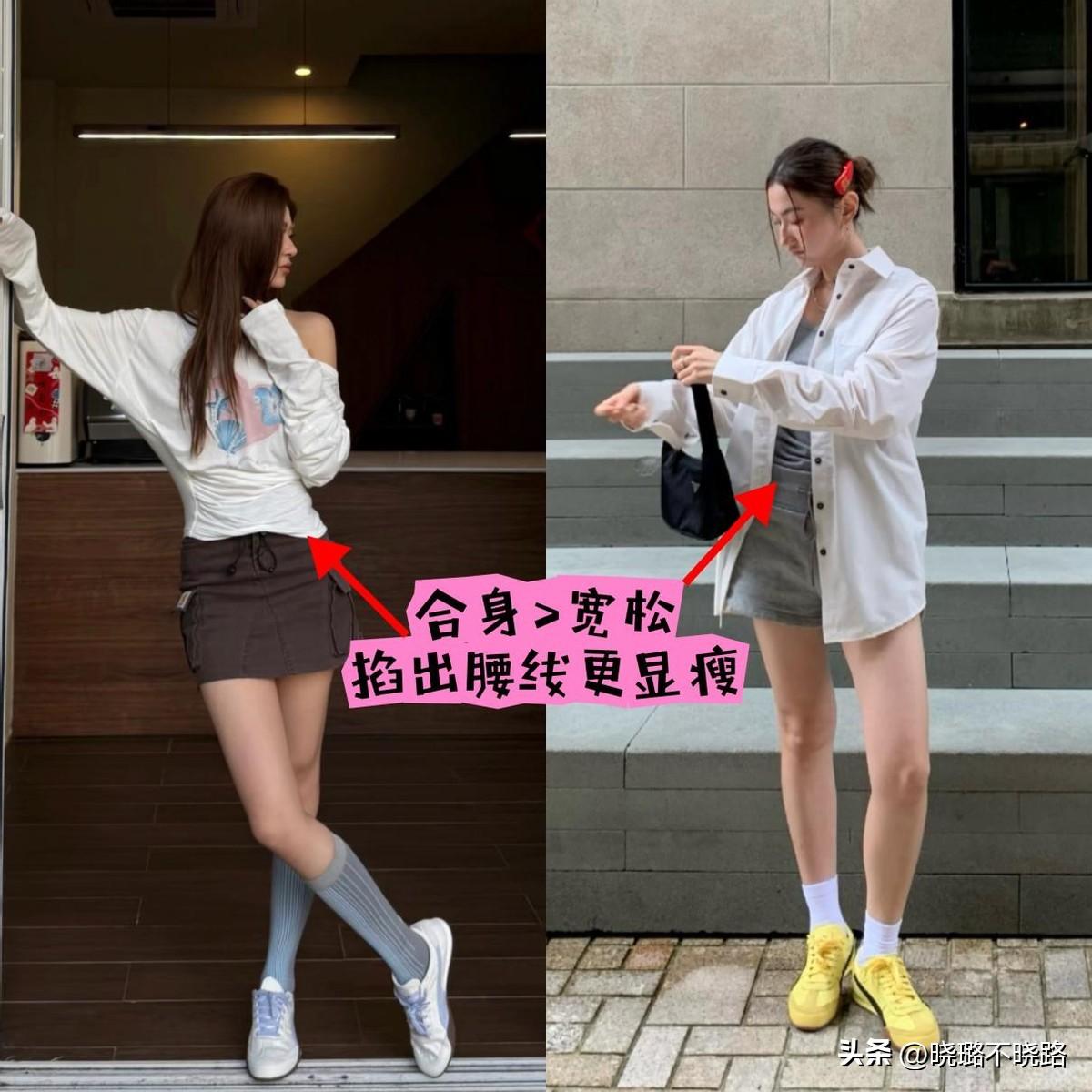 衣服的合身度非常重要,相比起oversize版型的單品,其實更推薦大家選擇掐出腰線、修飾肩型的衣服,尤其是下裝的挑選,千萬不要有堆積感,選擇短裙、短褲進行搭配,效果會更勝一籌。