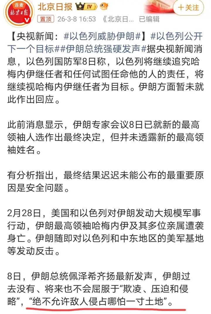 這也說明,裴澤希齊揚,一開始是想要和解的,就屬於溫和派。但緊接着在8日的時候,裴澤希齊揚就發聲“伊朗過去沒有、將來也不會屈服於欺凌、壓迫、和侵略。決不允許敵人侵佔哪怕一寸土地”。