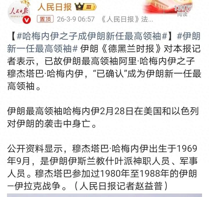 因爲伊朗宣佈的新任最高領袖是哈梅內伊的兒子——穆傑塔巴,哈梅內伊生前就表示不搞世襲制,讓兒子繼任確實有點意想不到。