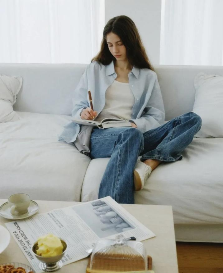 不喜歡基礎款襯衫,可以嘗試下牛仔藍襯衫,溫柔的水藍色襯衫,內搭一件白色背心,層次感就出現了。這樣的穿法清爽又不會太顯單調,下裝搭配一條牛仔直筒褲,利落顯瘦還不失隨性,腳下以上白色運動鞋,也太減齡舒適了。