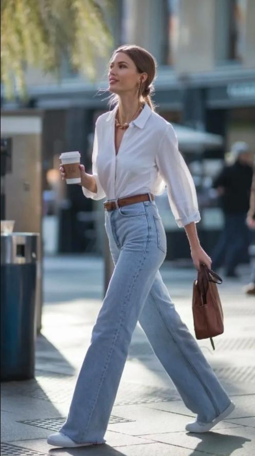 或許是選擇淺藍色高腰直筒牛仔褲,搭配白色襯衫,將襯衫的下襬塞進褲子裏,很好提高了腰線,不僅顯高挑還顯腿長。再加上一條腰帶,增加了造型的細節感,腳下的小白鞋與白襯衫相呼應,稍微再配合一些金屬項鍊的點綴,整個穿搭優雅時髦又不失輕鬆。