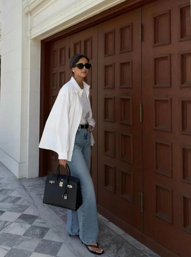 白襯衫敞開來穿,或者是直接當外套,都是很不錯的選擇,內搭白色背心或白色t恤,再加上高腰直筒牛仔褲,優雅灑脫又帶着幾分少年感,很減齡好看呢。