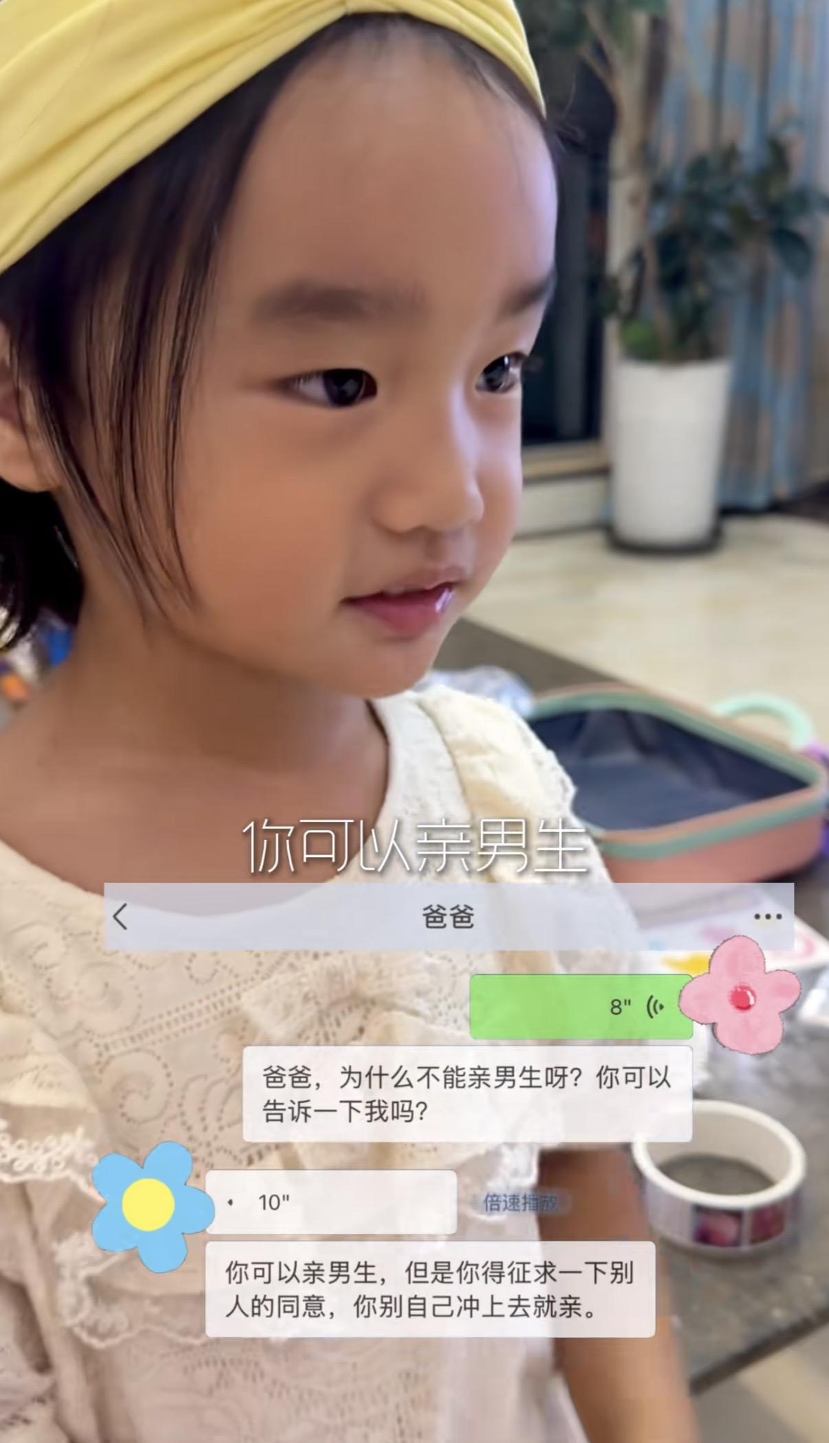 當夏夏問爸爸,我爲什麼不可以去親男生的時候。李亞鵬很溫柔的回答,你可以親男生,但你要徵得對方的同意,不要自己衝上去就親。