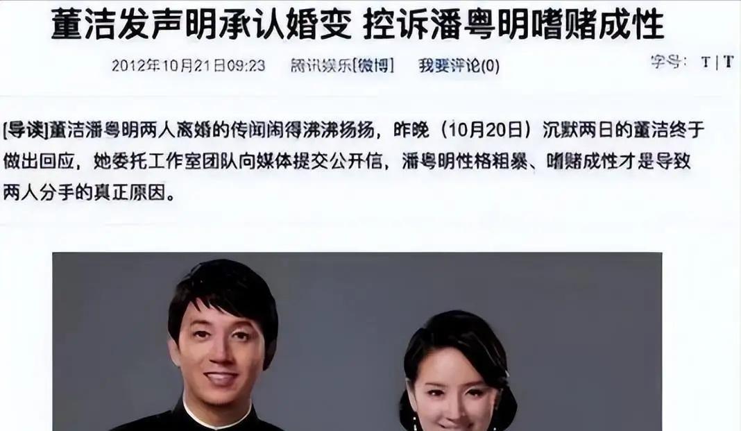 按理說,這個時候老婆應該不離不棄、書寫愛的戀歌。可並沒有,潘粵明等來的是一記重錘,董潔發佈離婚聲明,還給潘粵明釦上嗜賭成性、欠下鉅款的大帽子。