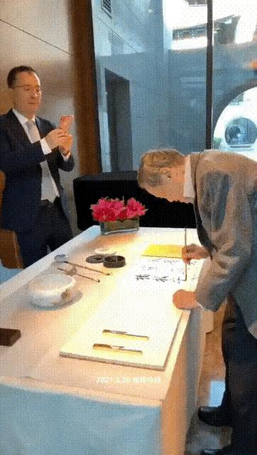算起來上一次翁帆寫毛筆字,還是和楊振寧一起。記得像是楊振寧生日的時候,他拉着翁帆一起寫下名字。翁帆還推辭說自己寫的不好,楊振寧就陪着她一起寫。