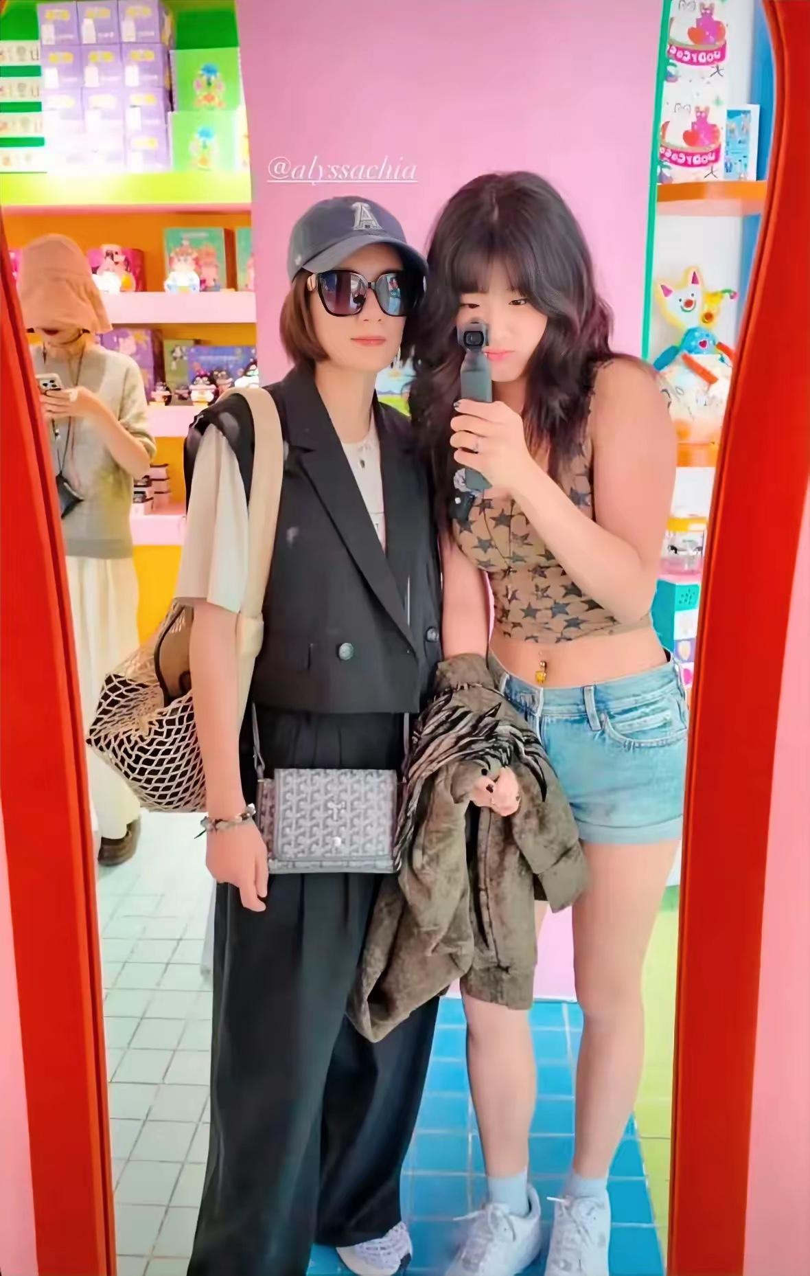 不知道是不是父母婚姻對他影響很大,還是梧桐妹本身就是有性格的女孩子。哪怕和賈靜雯一起出街,她也喜歡穿着熱辣的露臍裝。
