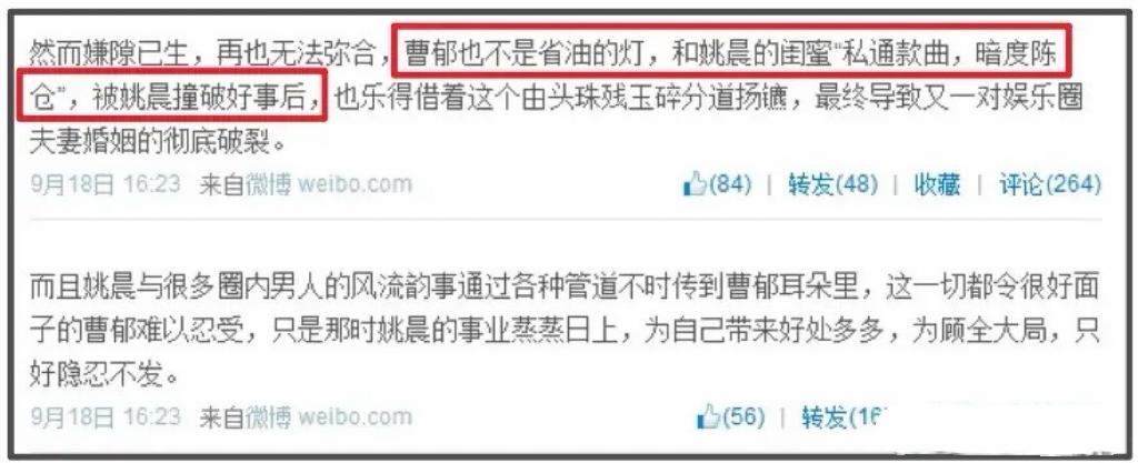 2014年的時候,博主公開指名爆料姚晨和二婚老公婚變,當時姚晨剛生完兒子“小土豆”。而婚變原因則是曹鬱和姚晨閨蜜“暗通款曲”被姚晨撞破了……