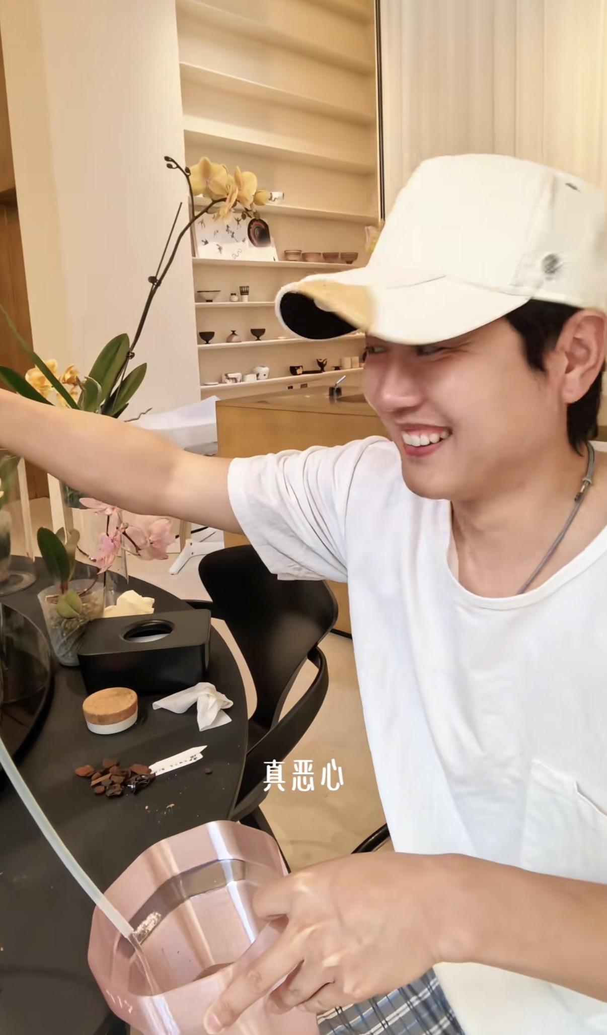 孟鶴堂在生活中也是很有趣,有一個花瓶裏的水放多了,他直接找來吸管、把裏面的水吸了出來。