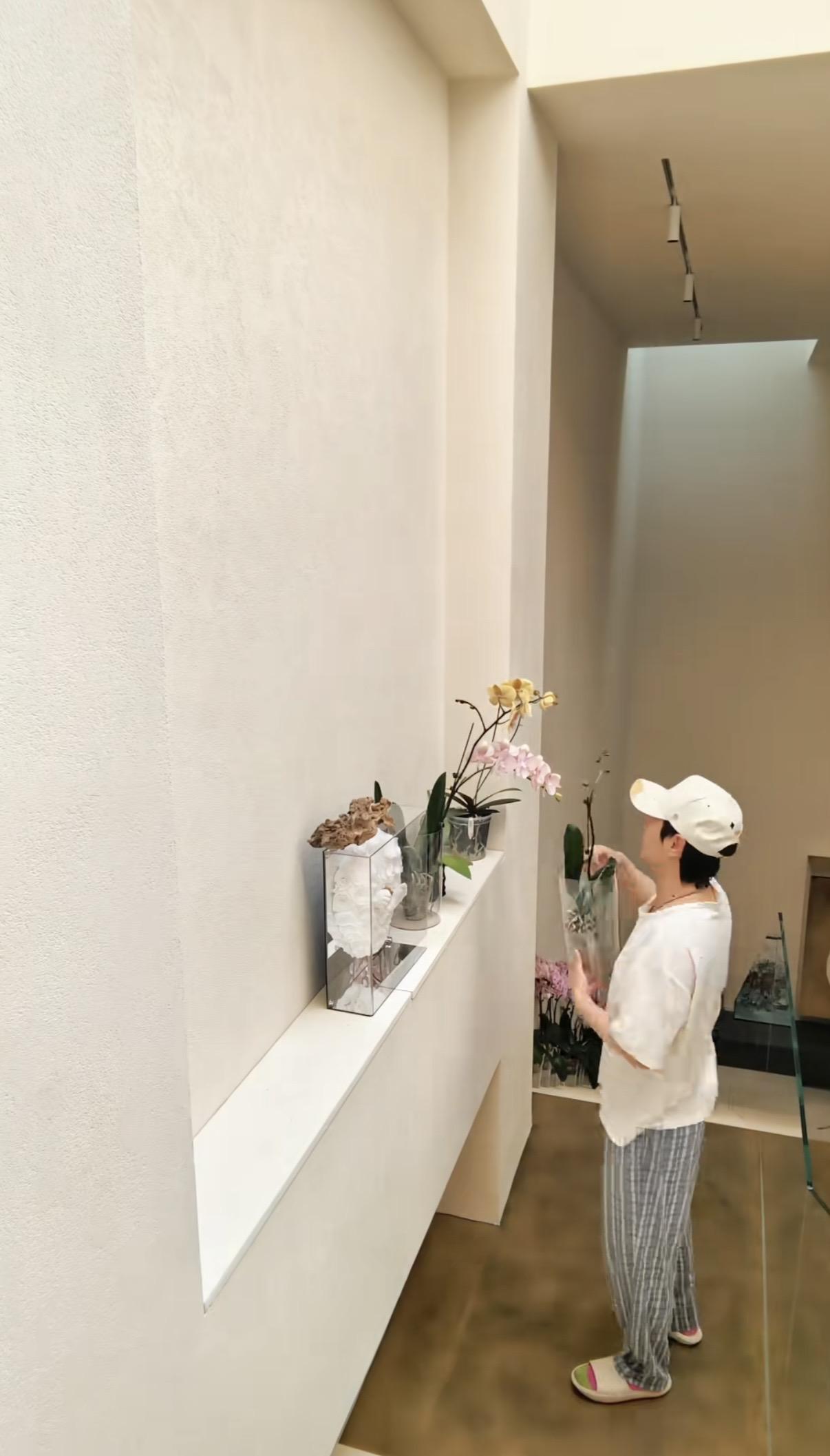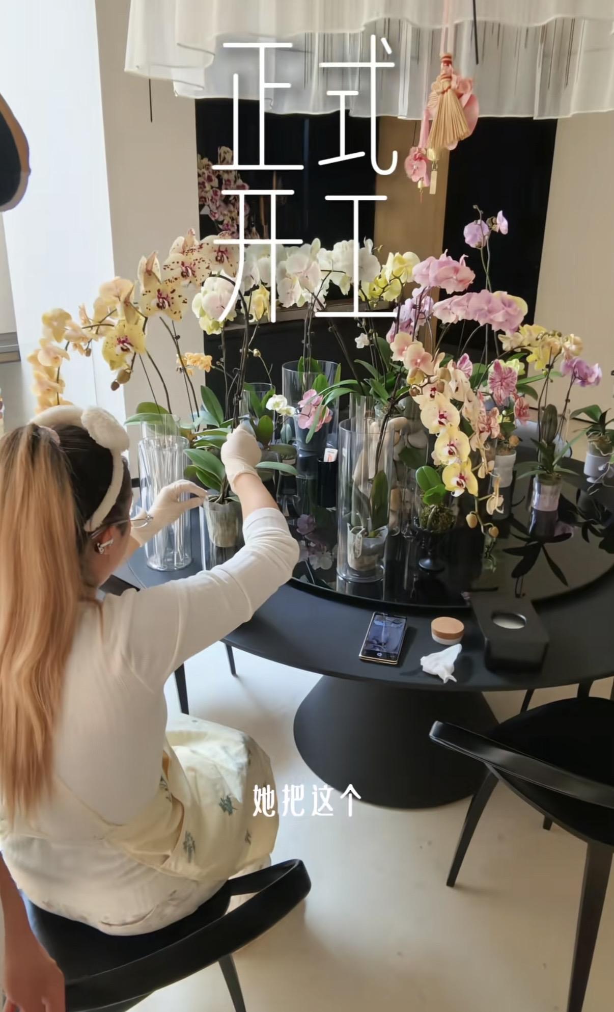 像邴禛禛這樣的女人,她更懂得如何取悅自己。把家裏的花全都搬到圓形的餐桌上,分別移栽到好看的花瓶裏,並且給鮮花塑形,這也是一種很高超的手藝。