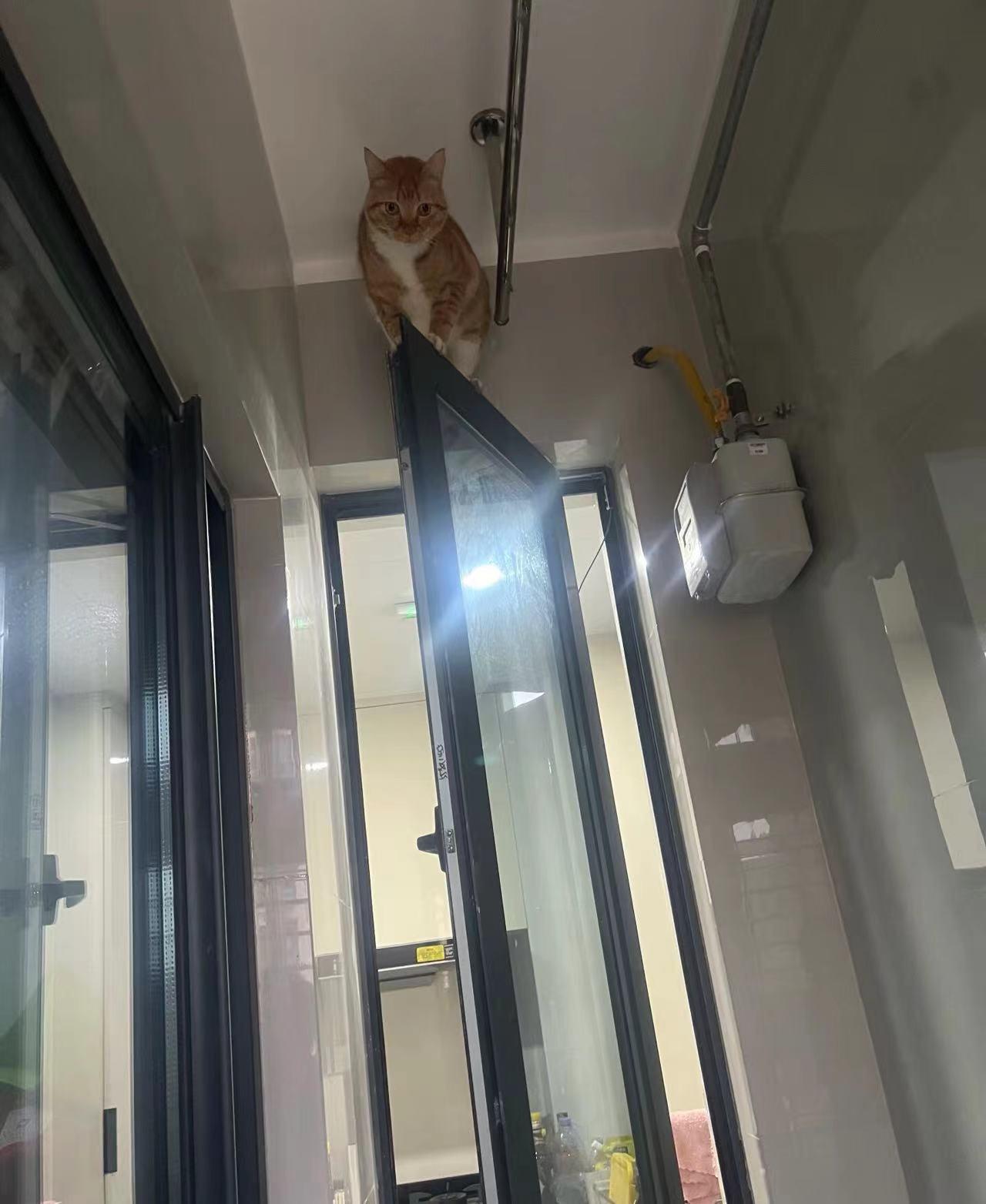 那天,網友一抬頭,小白貓神不知鬼不覺地站在了門框最頂端。