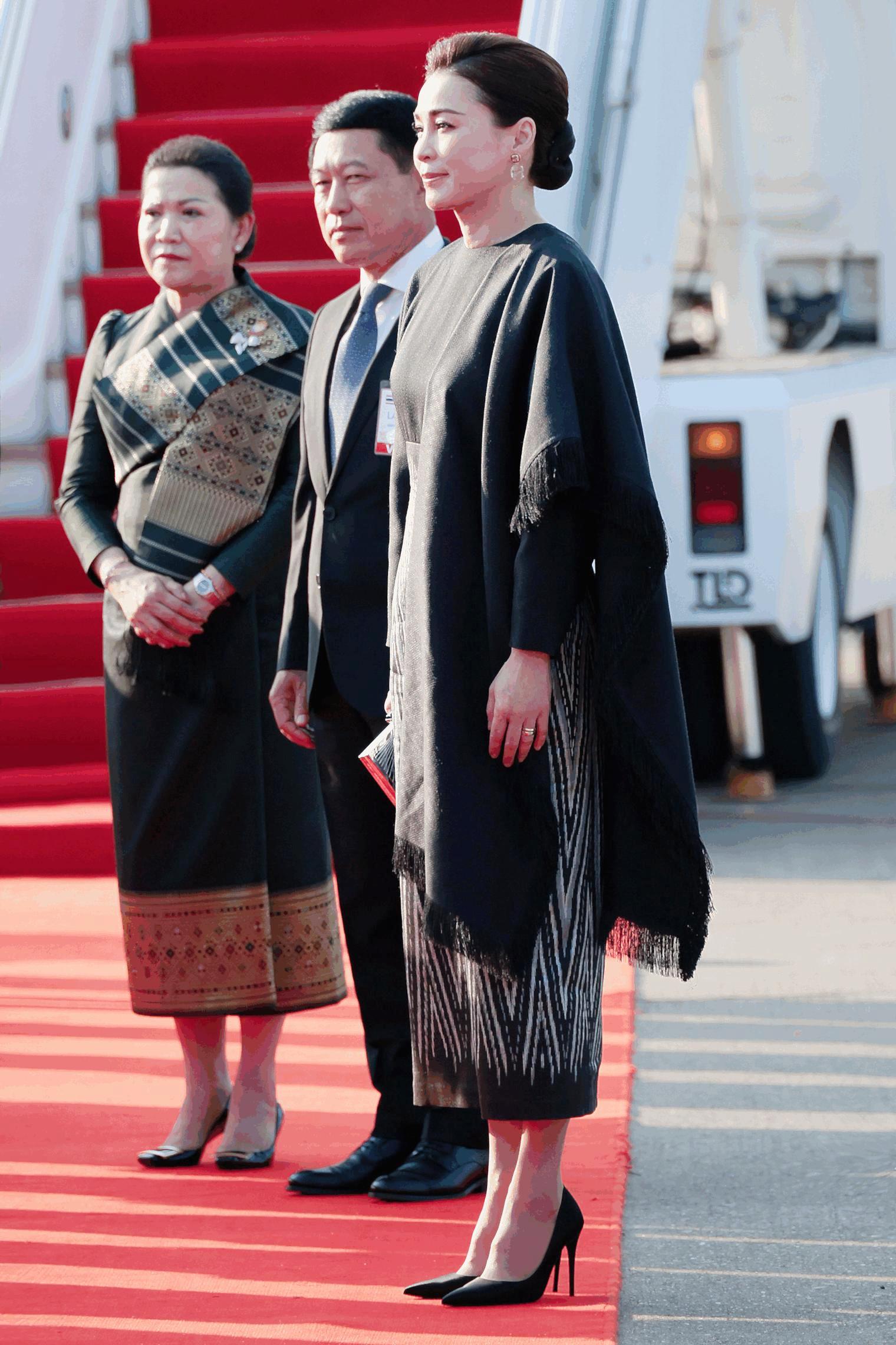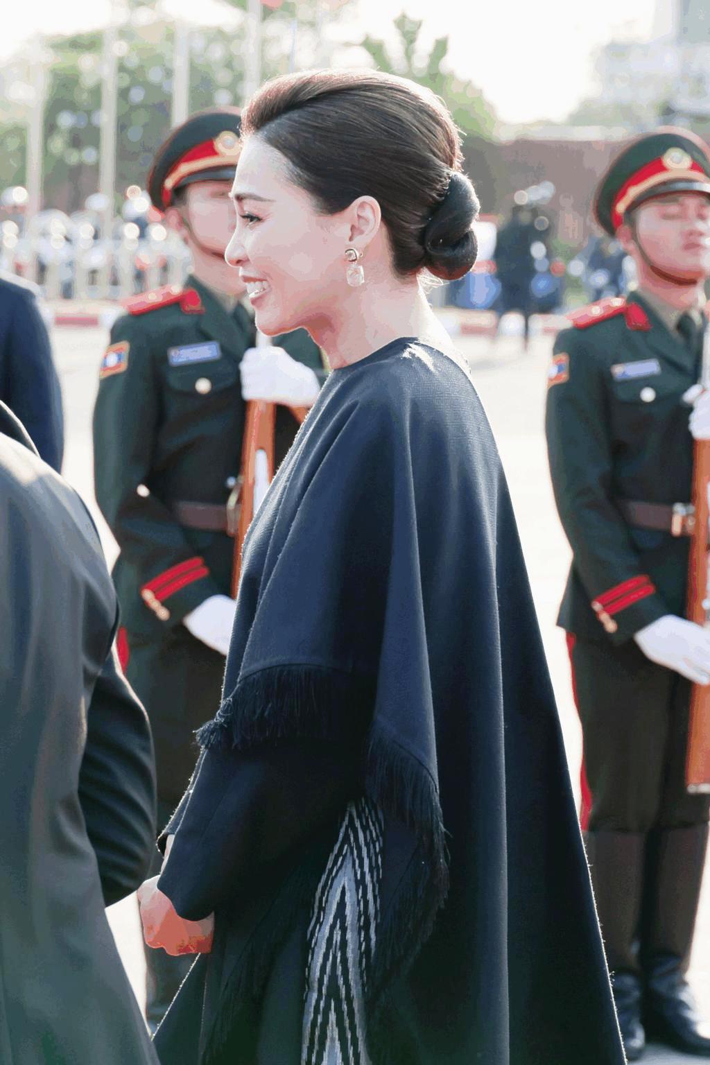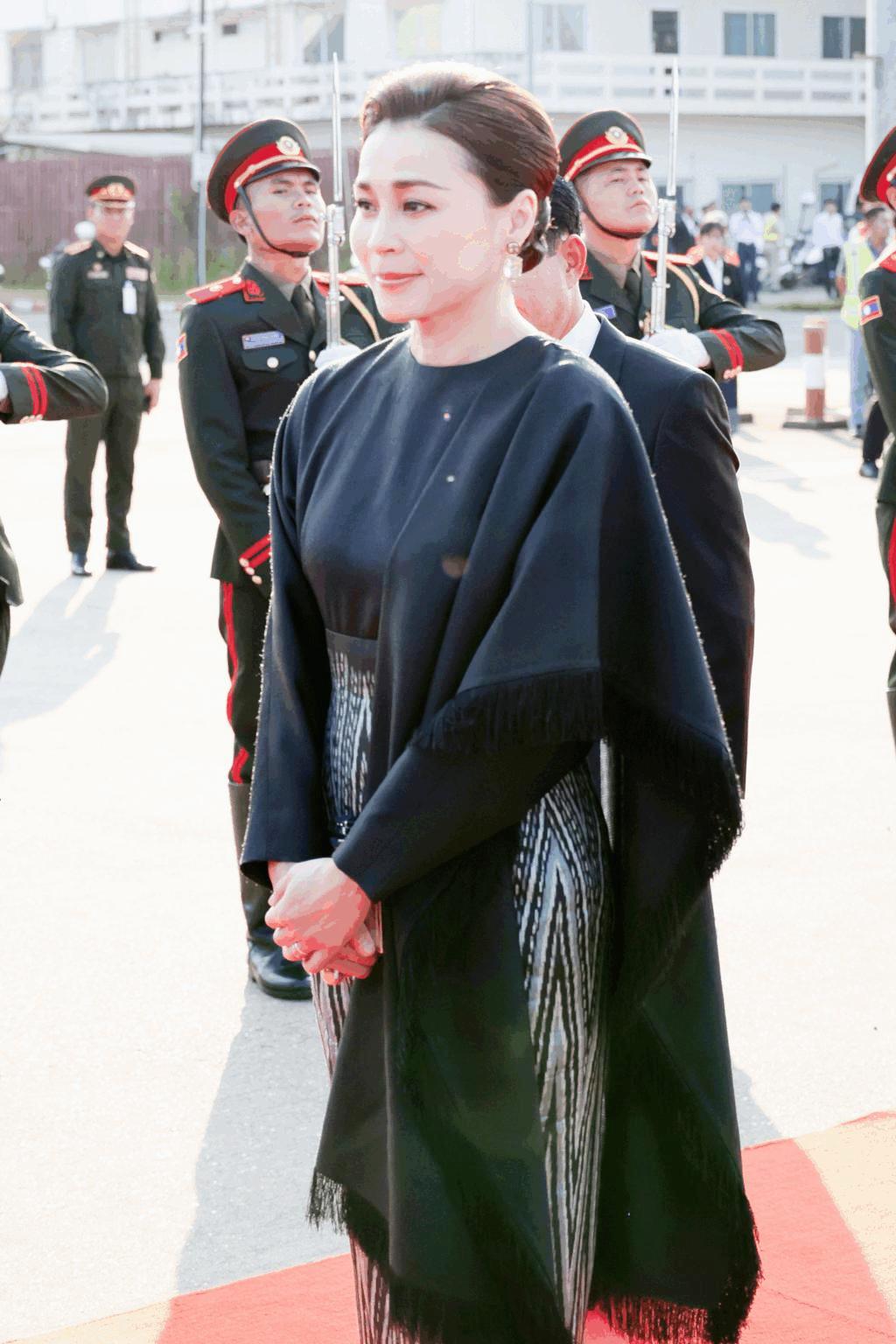 抵達老撾瓦岱國際機場時,蘇提達王后身着的斗篷裙,是傳統泰式元素與現代時尚設計的完美碰撞。裙襬融入泰國傳統服飾的紋樣元素,細膩的刺繡勾勒出泰式美學的精緻,彰顯了泰國傳統文化的深厚底蘊;而斗篷的設計則極具現代感,線條流暢、版型大氣,既修飾了身形,又增添了幾分霸氣,打破了傳統泰服的刻板印象。