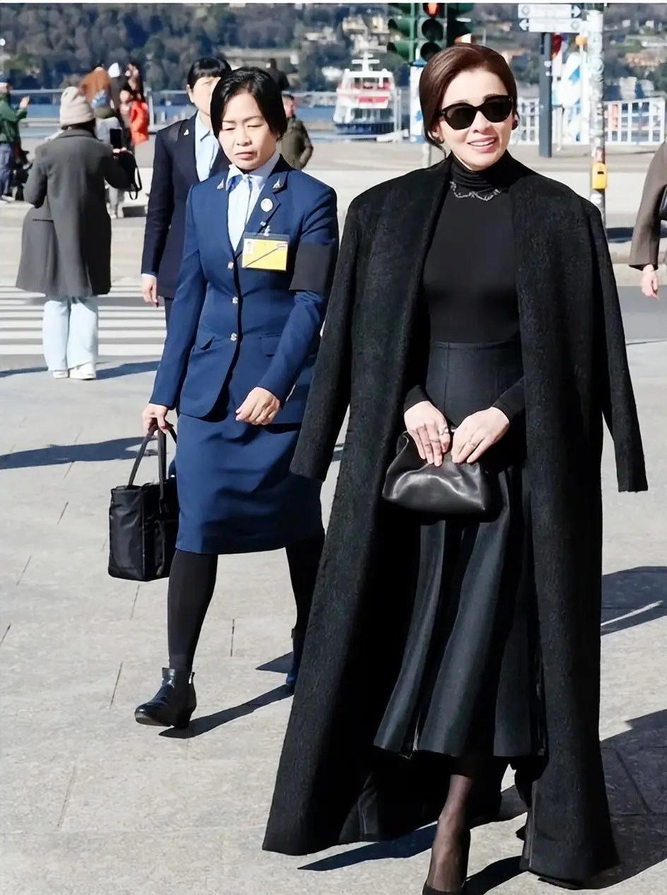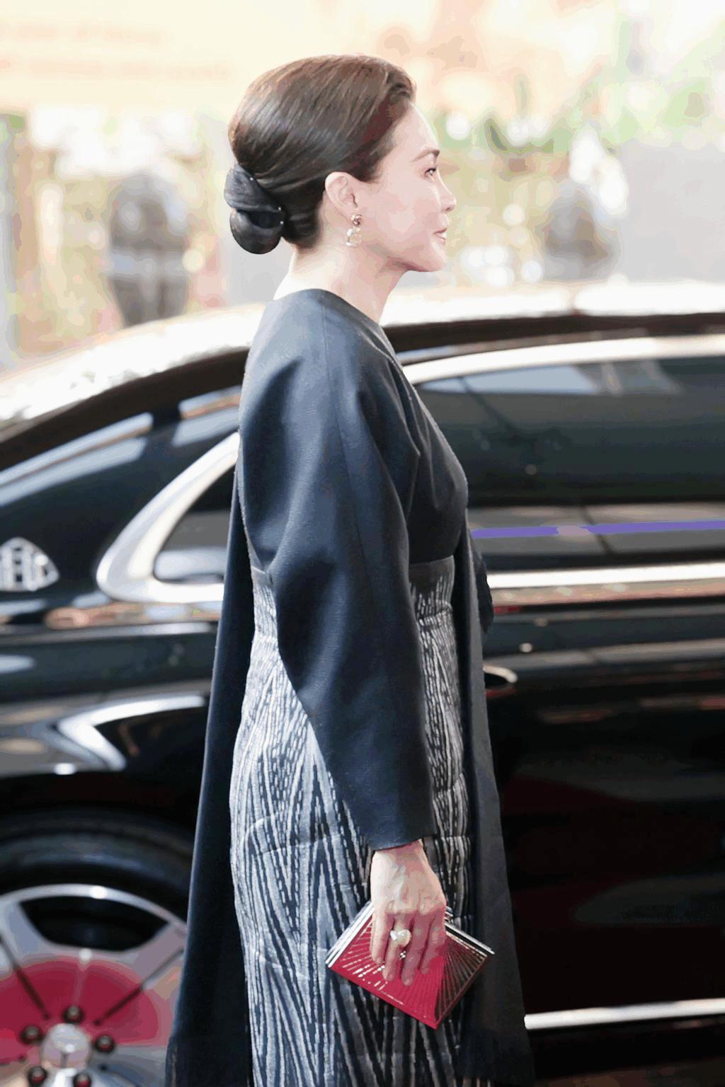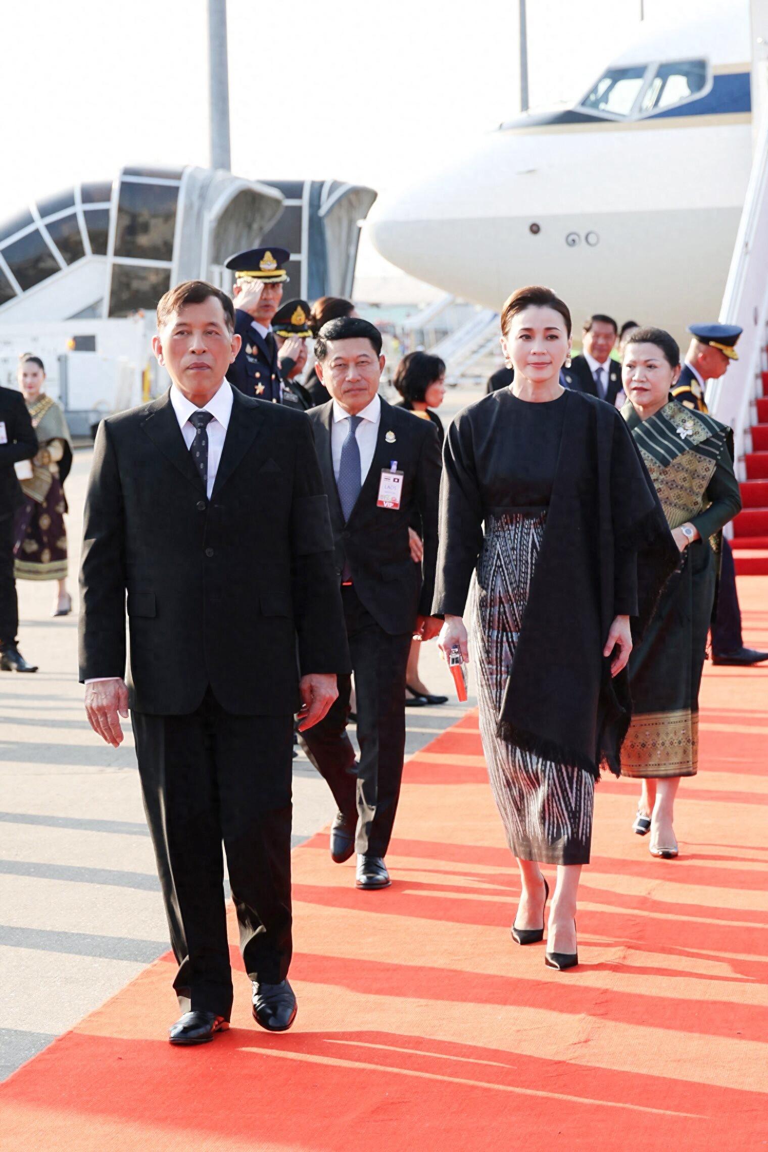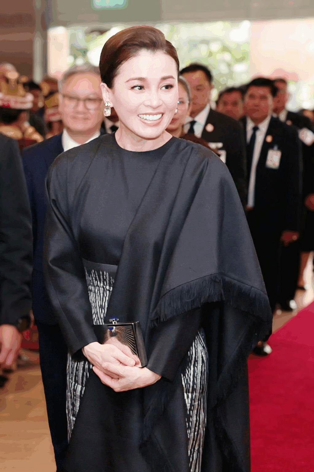 抵達老撾瓦岱國際機場時,蘇提達王后身着的斗篷裙,是傳統泰式元素與現代時尚設計的完美碰撞。裙襬融入泰國傳統服飾的紋樣元素,細膩的刺繡勾勒出泰式美學的精緻,彰顯了泰國傳統文化的深厚底蘊;而斗篷的設計則極具現代感,線條流暢、版型大氣,既修飾了身形,又增添了幾分霸氣,打破了傳統泰服的刻板印象。