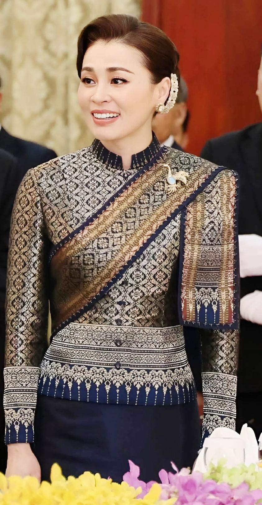 她身着的禮服在紋樣設計上特意呼應了老撾傳統圖案,線條柔和、色彩協調,既保留了泰式禮服的精緻,又融入了老撾文化的質樸,實現了兩種文化的溫柔碰撞。