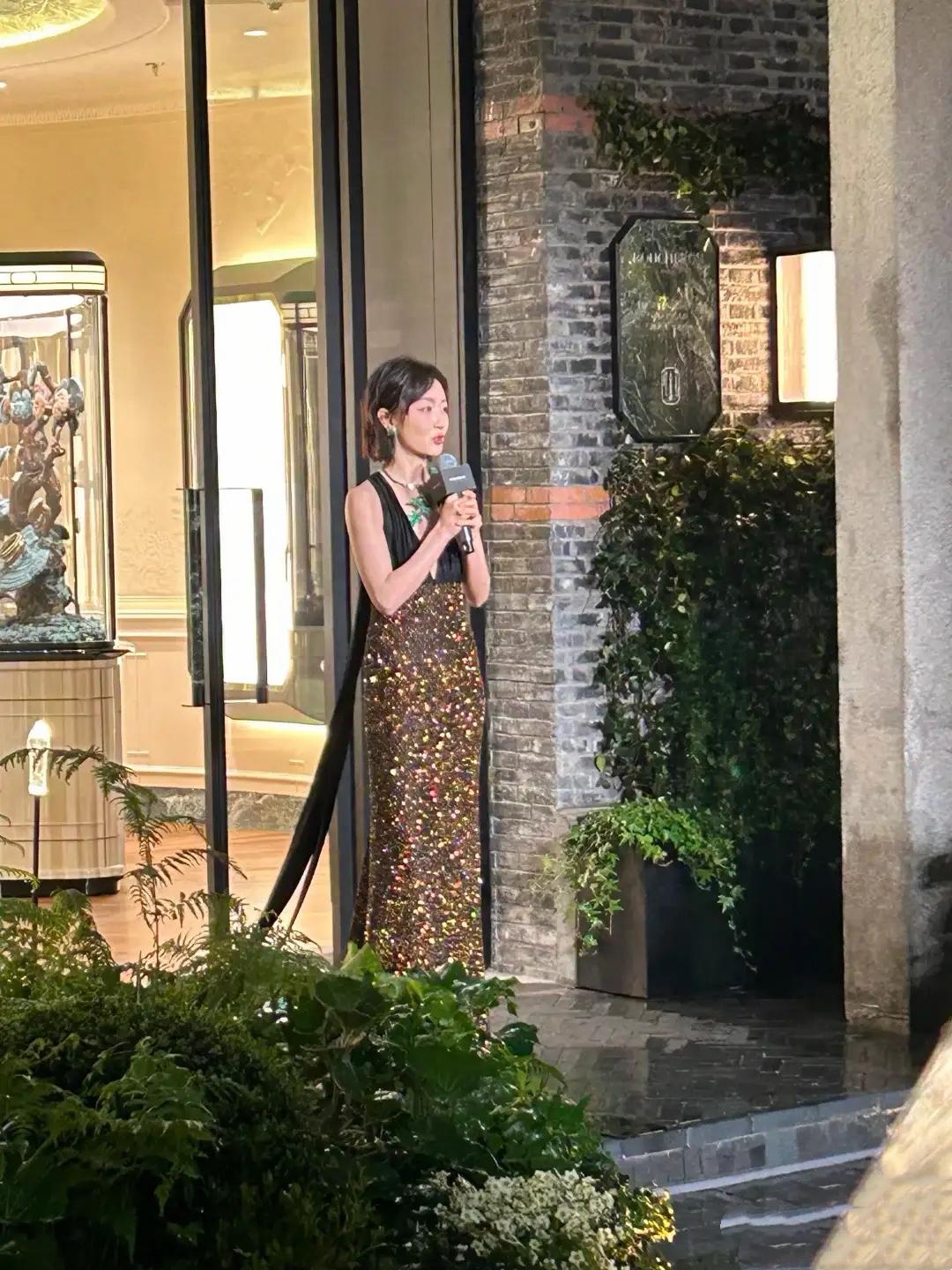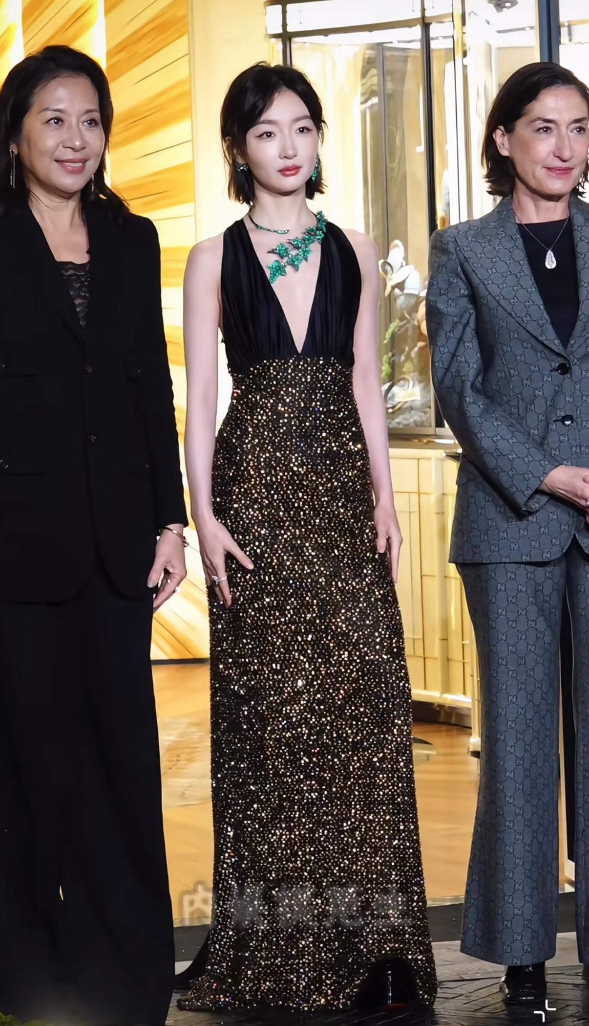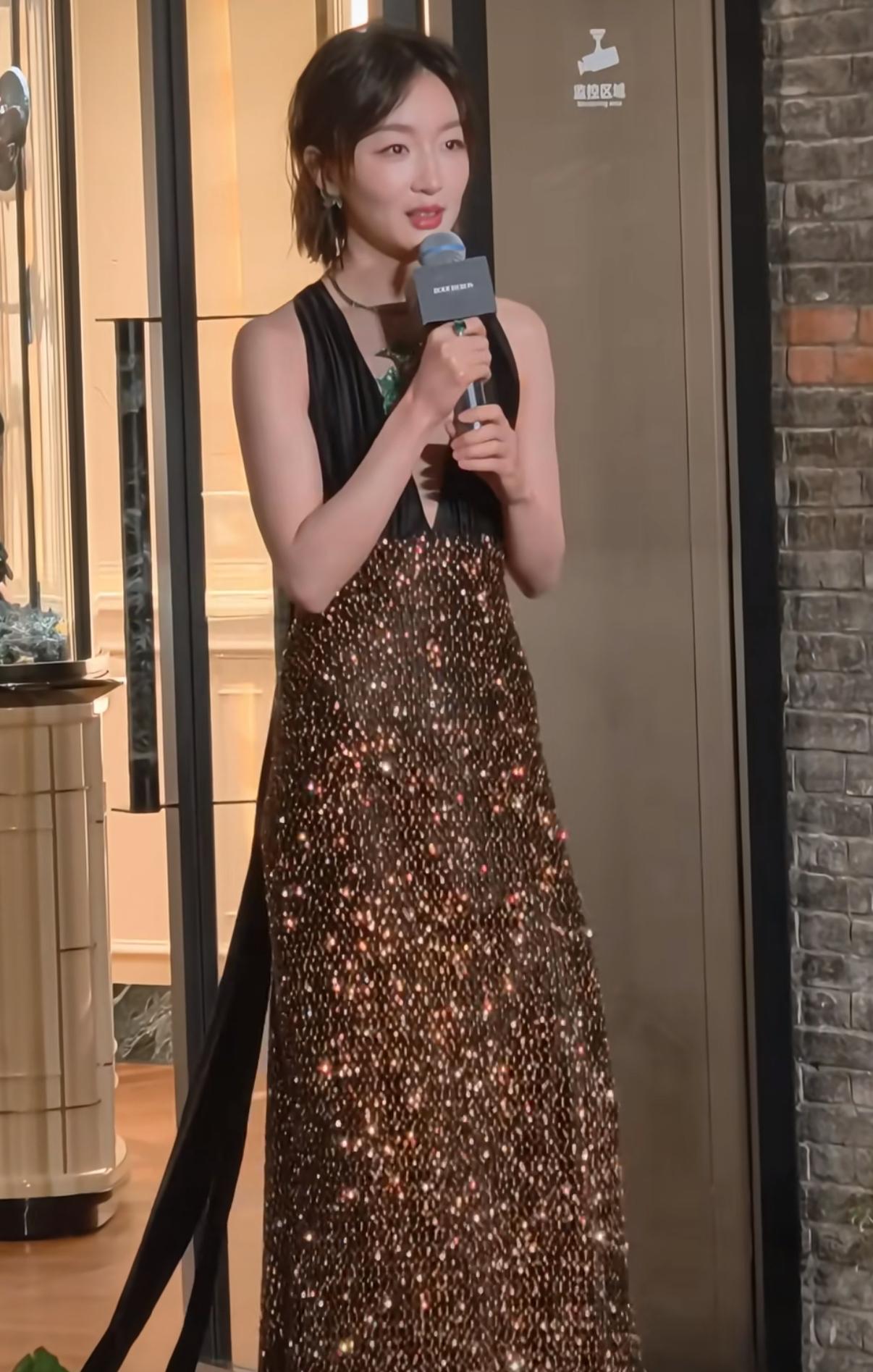 周冬雨再次“真空上陣”,穿了一件深V領的閃片長裙。