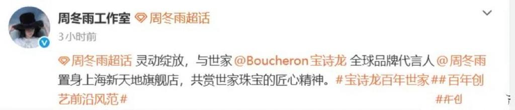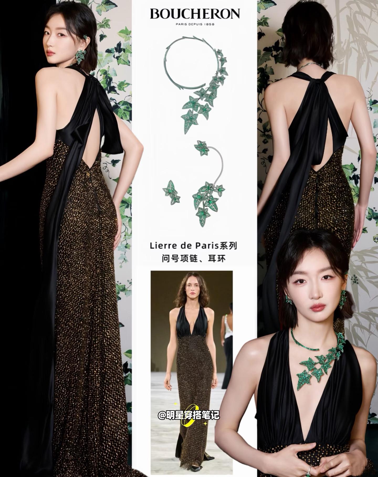 在工作室釋出的照片中,看到周冬雨穿着深V露背裙,戴着常春藤問號項鍊白金全鑽高階版,這屬於寶詩龍高級珠寶系列,媒體預估3000萬人民幣。