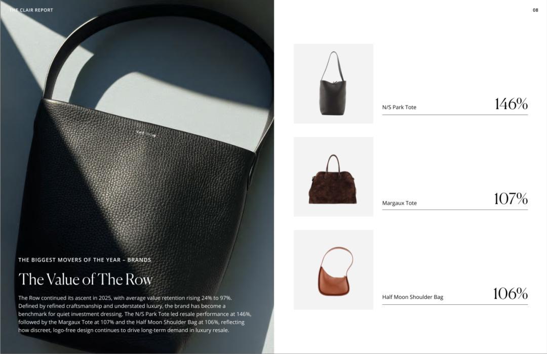 時尚機構Rebag在2025年大牌包保值率研究裏提出,The Row的包包成績相當亮眼,僅次於Hermès、Goyard、Telfar。這跟它極簡、不易過時的設計有很大的關係。