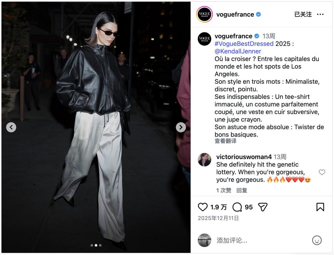 法版Vogue把她評爲2025“下班後”(off-duty)最佳穿搭人物之一。▼