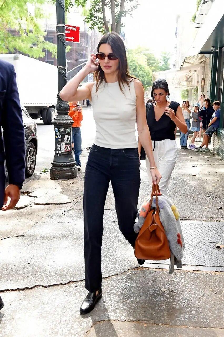 2023年,她被拍到背這隻vintage Kelly出現在巴黎,丹寧牛仔褲配深藍色短T,酒紅色Kelly剛好和皮帶呼應,經典的紅藍配。(這套的樂福鞋依然來自The Row。)▼