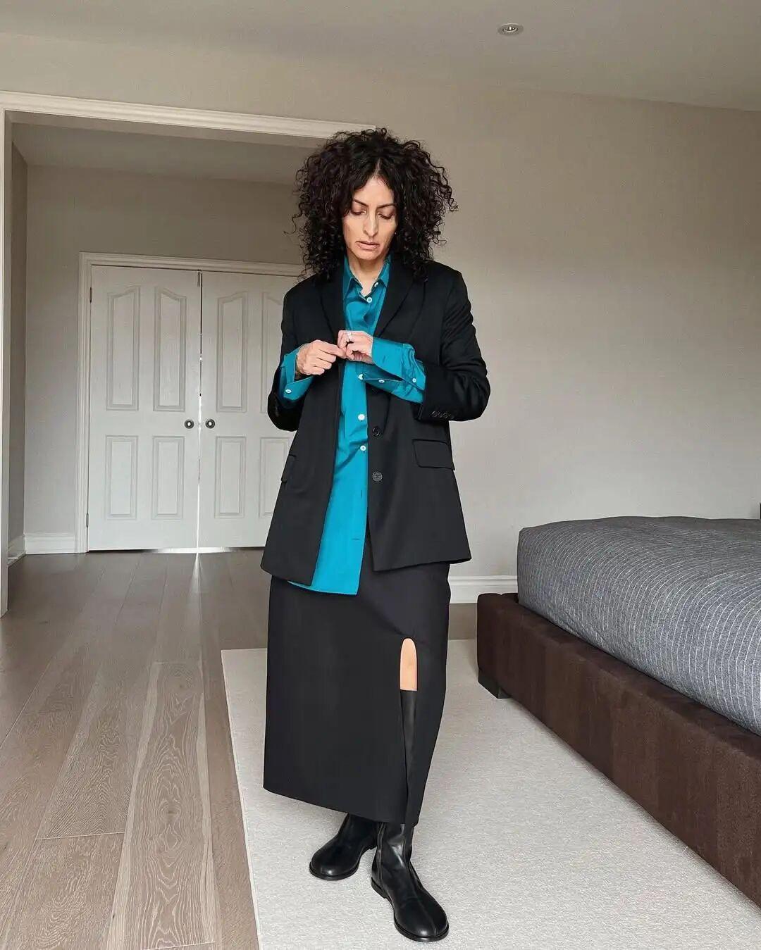 像造型師兼博主的 Neelam Ahooja ,她雖然是T he Row 的忠實粉絲和收藏者,但 她更喜歡的是T he Row 的風格。所以她也會混搭其他同樣極簡的品牌一起穿,比如COS、Studio Nicholson、La Collection。 ▼
