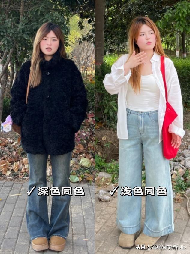 爲了減少身體被切割的段數,微胖的矮個子女生儘量採用“上下同色”或“鞋褲同色”的策略。這種色彩上的連貫性,能在視覺上形成一條垂直的線條,引導視線上下流動,從而在縱向上拉伸身高。相比之下,強烈的上下身撞色會將身體截成兩半,顯矮風險極大。