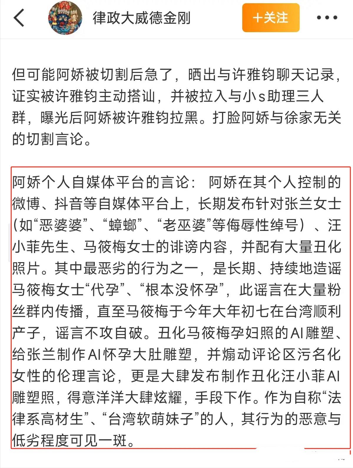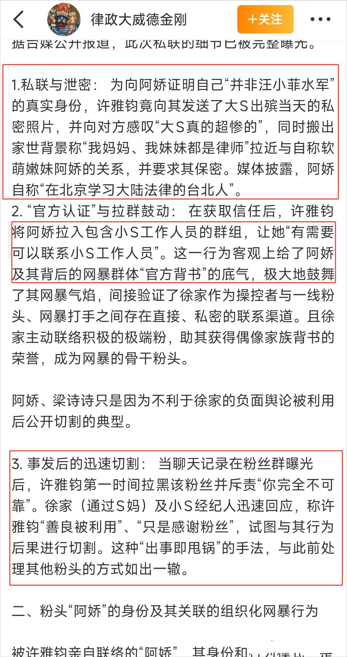 如果順藤摸瓜就會發現,這個女粉絲的賬號上有很多網暴汪家人的信息。S家的人、還有許雅鈞這麼做,主要還是對付汪家人。