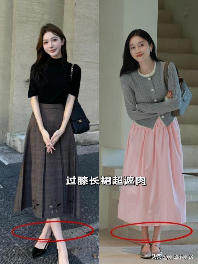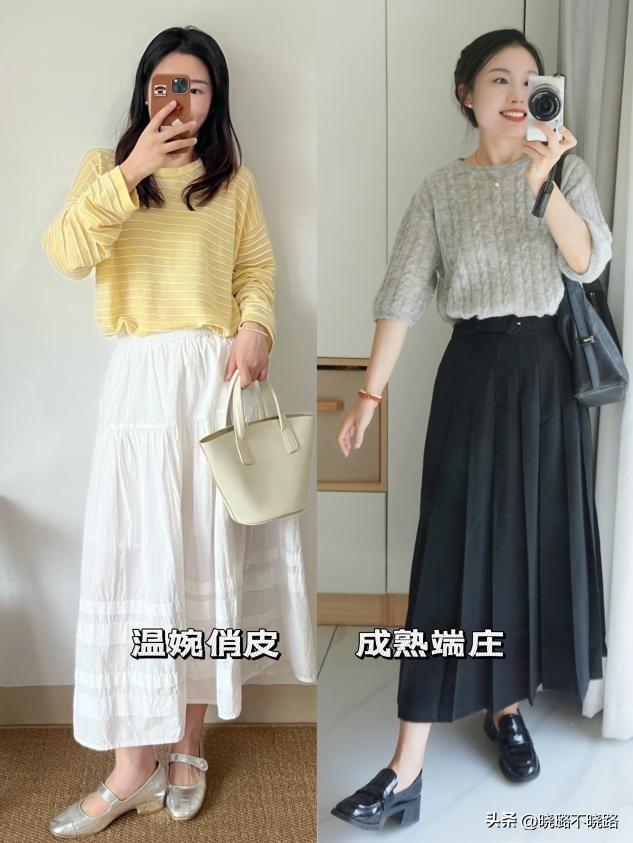 下半身選擇高腰A字長裙。A字的裙襬能很好地掩蓋大腿和臀部的肉肉,同時露出纖細的腳踝。將奶奶衫的下襬塞進裙腰一角,既明確了腰線,又保留了慵懶感。記住,裙長最好在小腿肚以下、腳踝以上,這是最顯輕盈的長度。