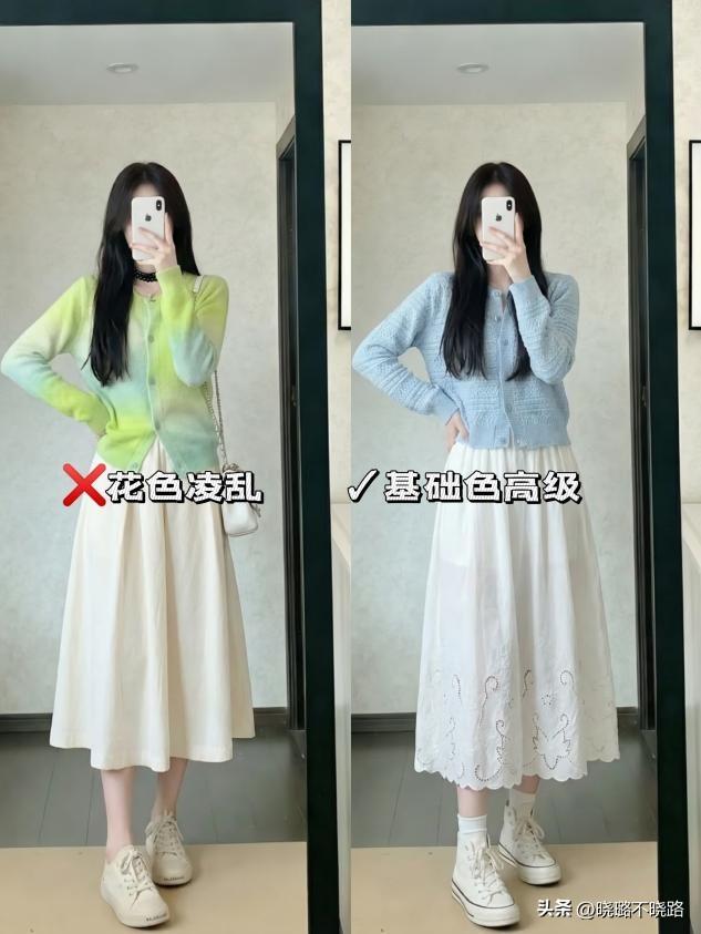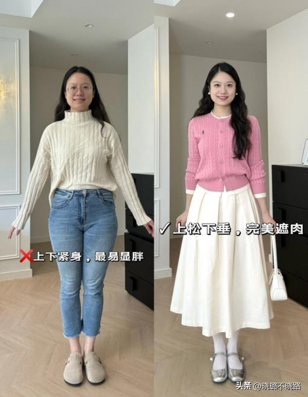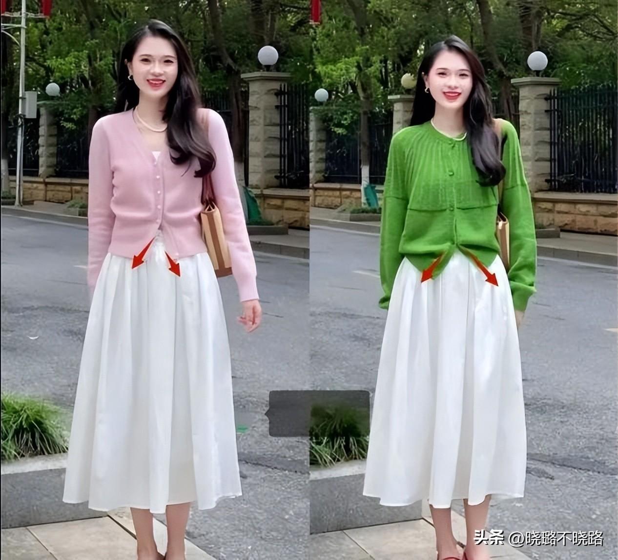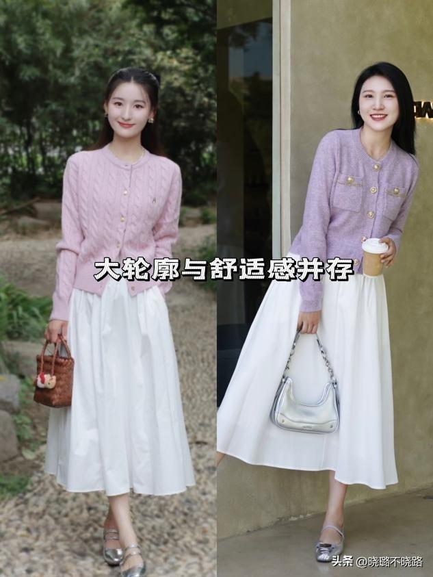 這是“奶奶衫+裙子”組合最核心的優勢。奶奶衫寬鬆的版型能完美遮擋上半身的贅肉(如拜拜肉、小肚腩),而V領設計能拉長頸部線條,顯臉小。下半身搭配高腰裙裝,不僅能遮住大腿和臀部的肉肉,還能通過提高腰線來優化身材比例。對於微胖女生,它是藏肉神器;對於小個子女生,它是顯高祕籍。