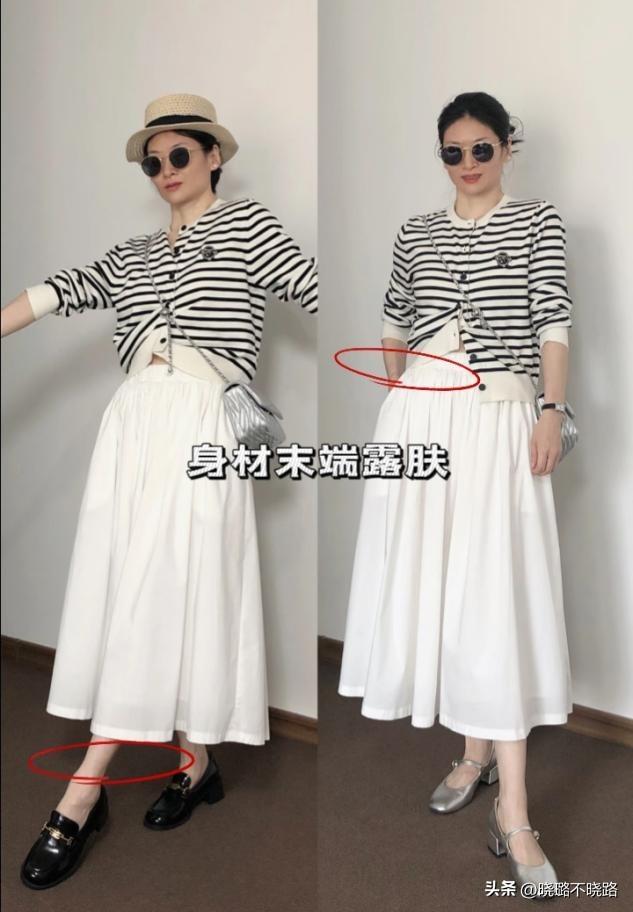 無論穿什麼長度的裙子,一定要露出腳踝。如果穿長裙,選擇開叉設計,走動間隱約露出腿部線條,既清爽又能減輕厚重感。配合V領露出的頸部肌膚,上下呼應,通透感十足,自然顯高。