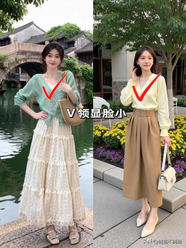 圓領容易顯得呆板且顯臉大,而大V領則是奶奶衫的靈魂所在。它能露出鎖骨和頸部肌膚,增加呼吸感,視覺上至少顯瘦5斤。如果買到的奶奶衫領口不夠低,不妨嘗試在裏面搭配。