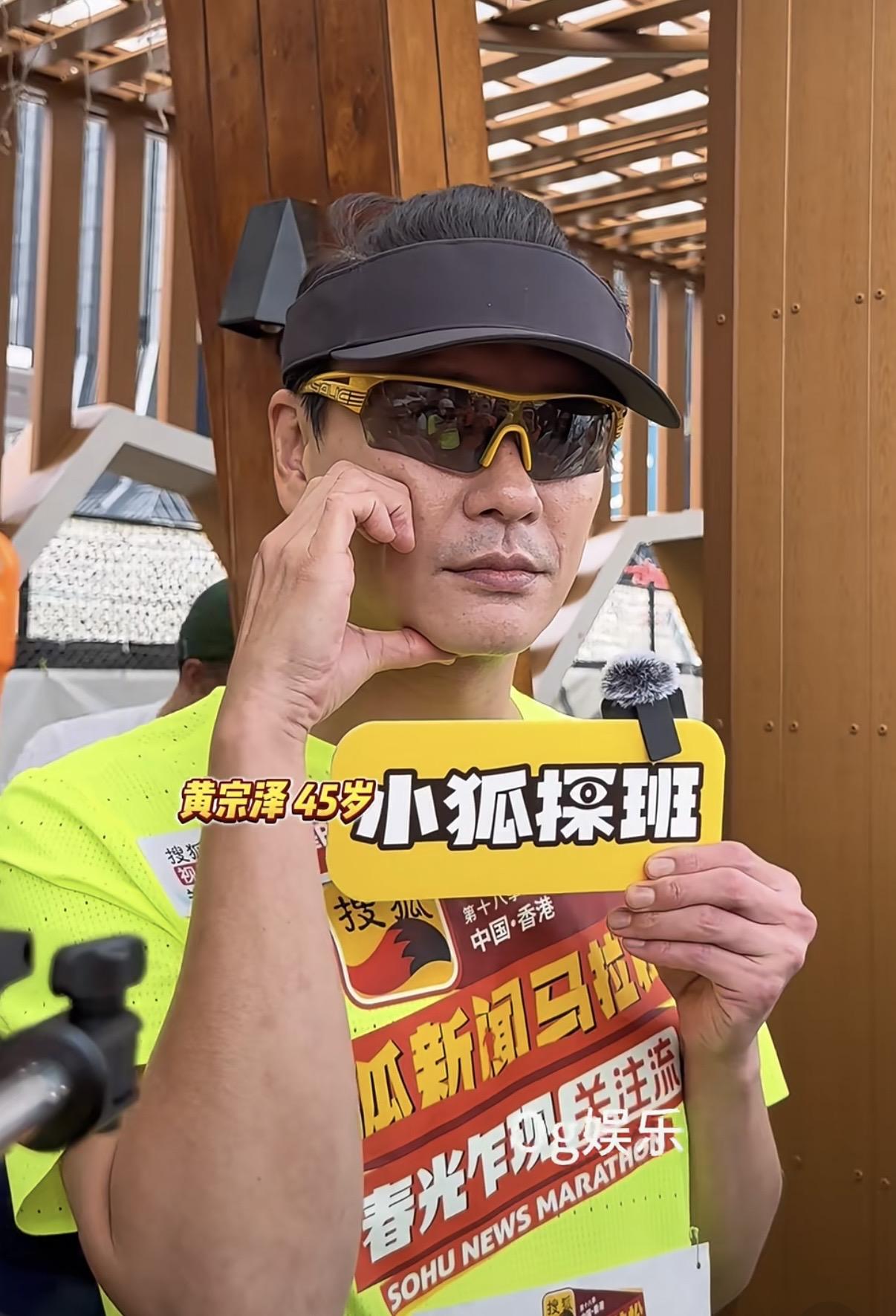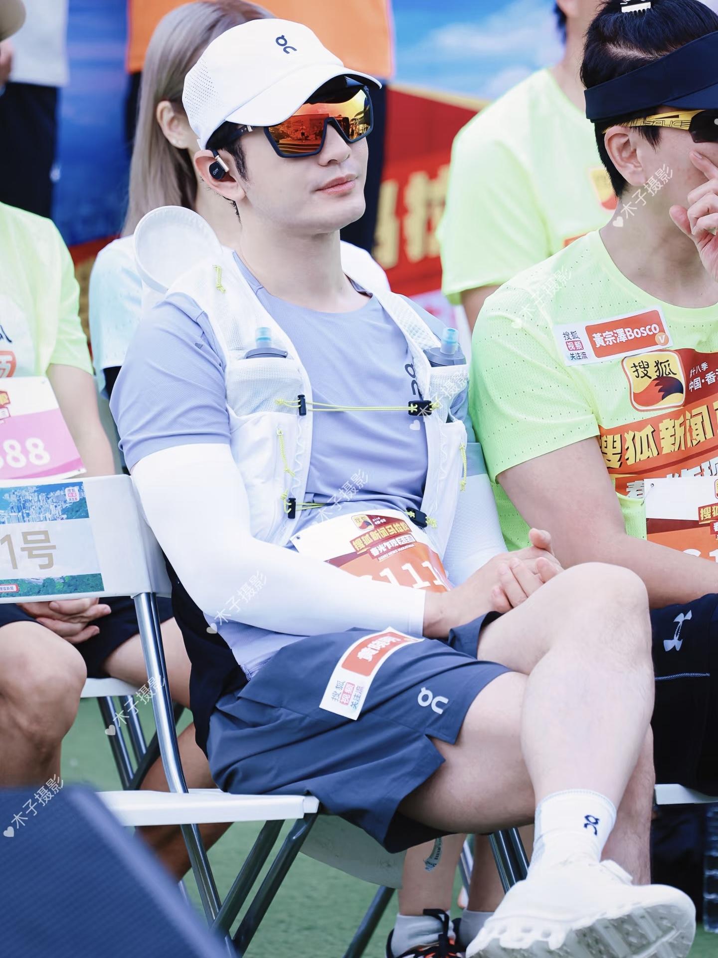 可能因爲黃宗澤這次是在家門口參賽,也沒好好捯飭就來了。他穿這熒光綠的T恤,戴了一頂黑色遮陽帽,完全沒有港劇男神的樣子。