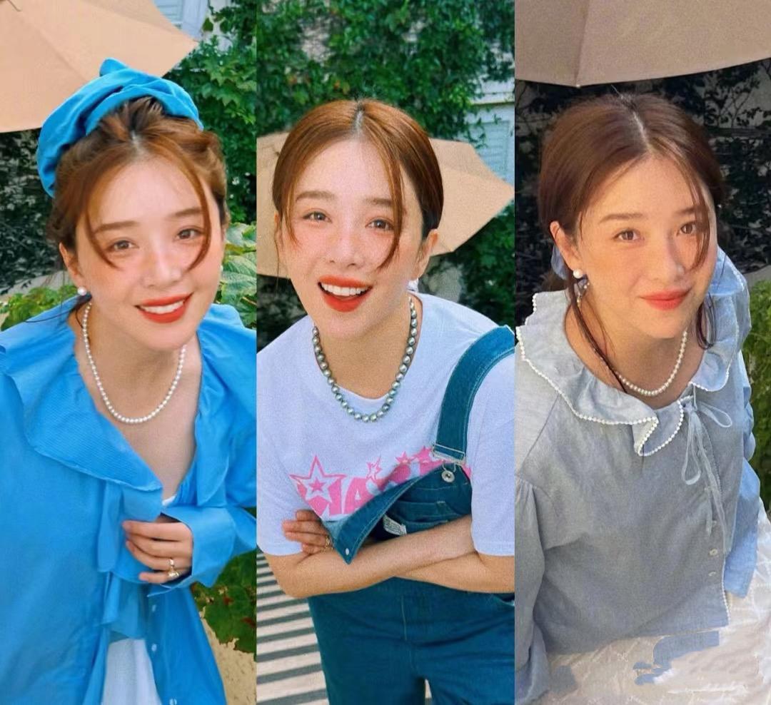 尤其是穿着寬鬆白襯衫的時候,有一種很輕盈、很純美的感覺。她的新發色很顯氣質,搭配珍珠耳釘、項鍊有一種不費力的貴氣。