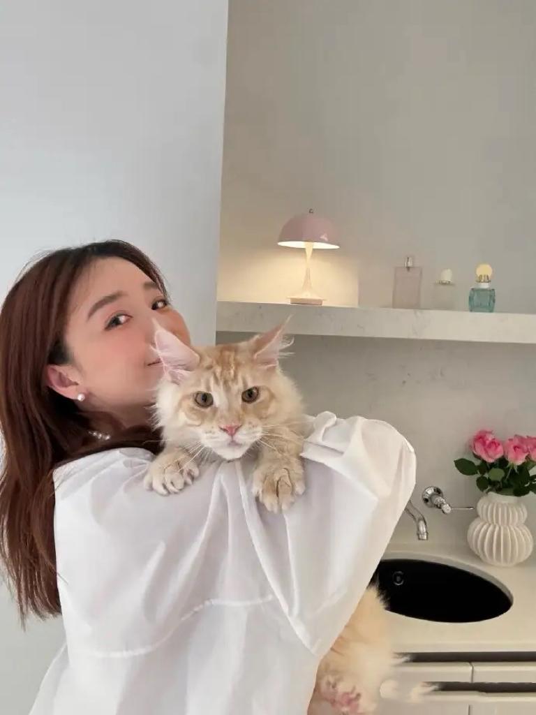 她穿着白襯衫的生活照,面色紅潤、甜美可人。肩膀上抱着一隻可愛的小貓咪,眉眼間都是溫柔。