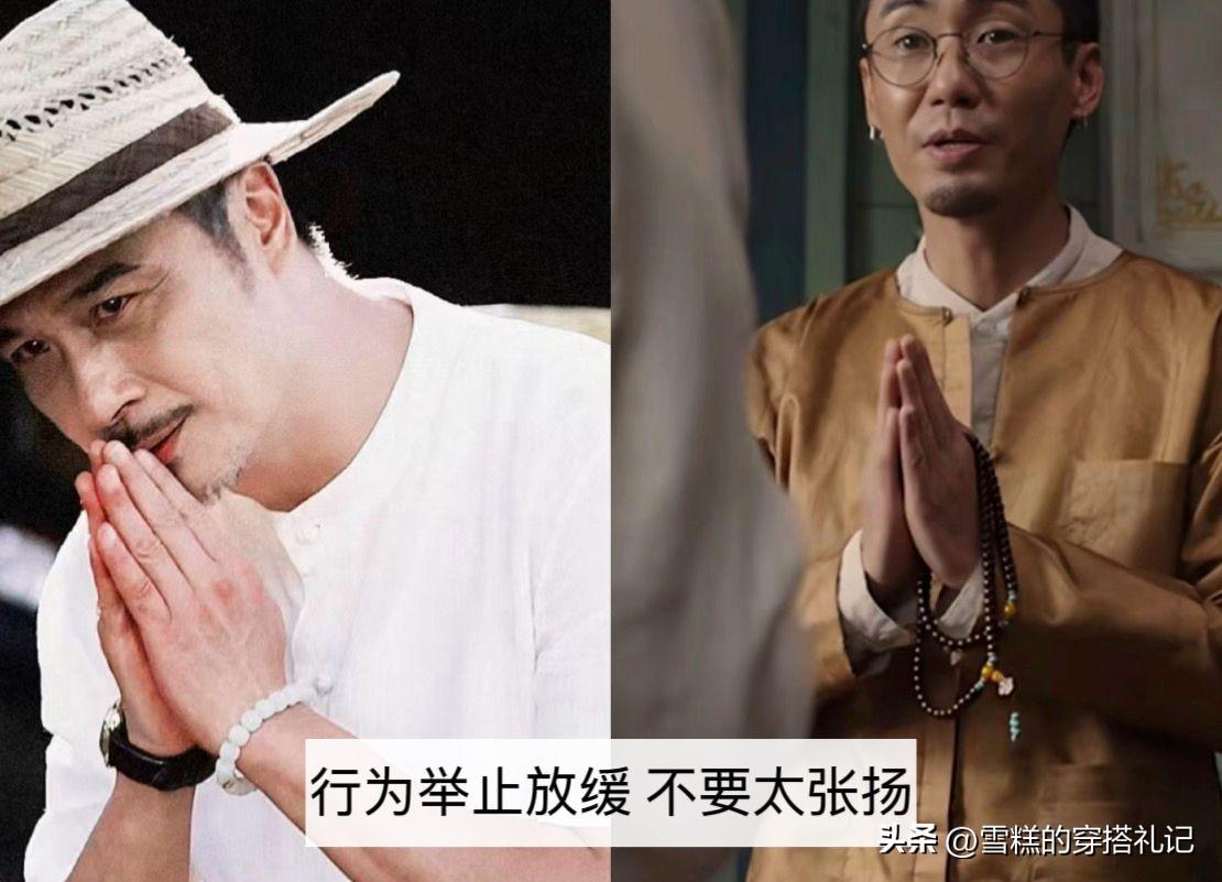 例如新中式的唐裝,加入了盤扣、立領的設計,很好的增加了造型的辨識度,寬鬆的版型,又能巧妙的遮住歲月的痕跡,贅肉通通藏起來,再佩戴上手串,更有鬆弛感。