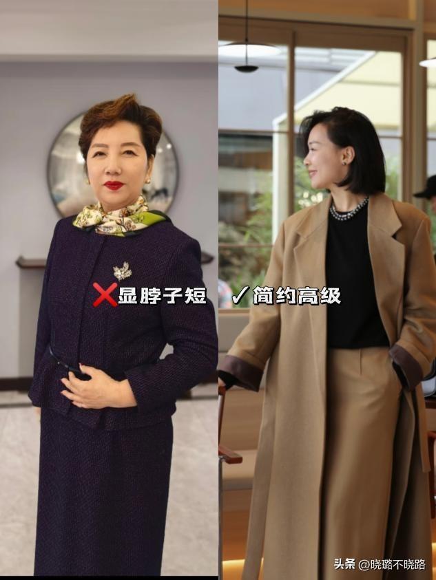 在傳統觀念裏,絲巾被視爲成熟女性的必備單品,用來遮擋頸紋、提亮膚色。於是,我們常看到各種高飽和度的大花、幾何圖案絲巾,被緊緊地系在脖子上,甚至層層疊疊。視覺上畫蛇添足,50歲+的女性,氣質本就沉澱得足夠深厚。如果此時再在頸部堆積大量複雜的色彩和圖案,不僅無法起到點綴作用,反而會喧賓奪主,掩蓋了穿着者本身的面部光彩,顯得累贅不清爽。