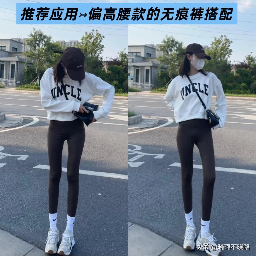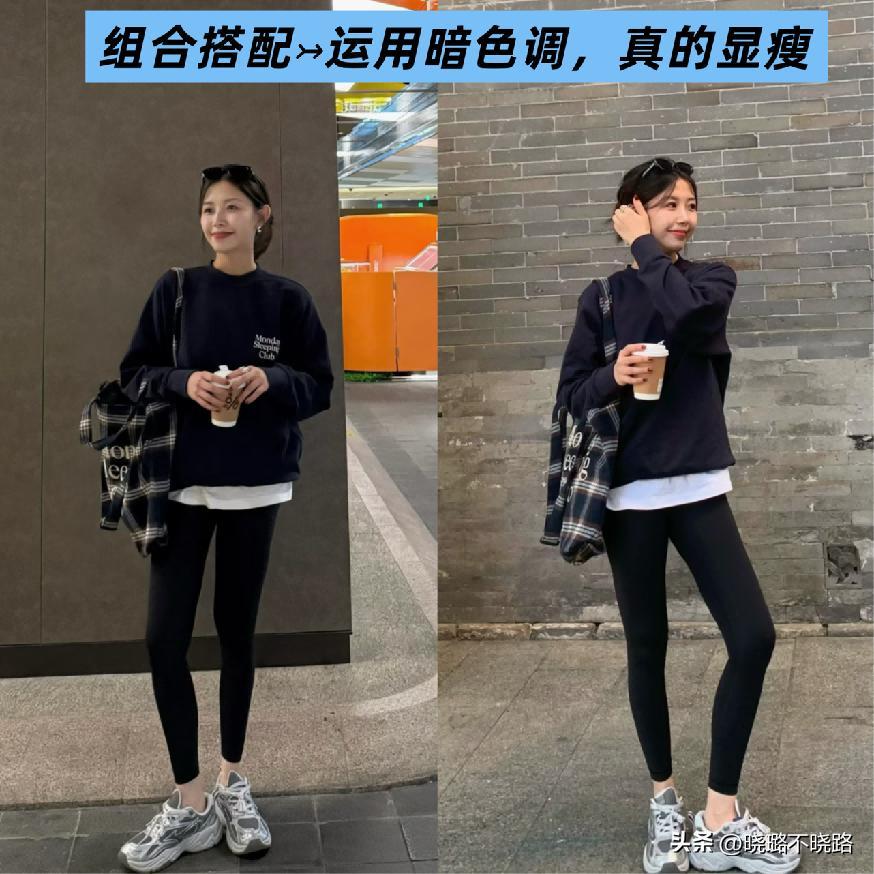 如果你是屬於上半身比較顯胖的話,那麼大家不妨可以運用略微寬鬆的衛衣,結合瑜伽褲,並且比較重點的搭配就是這兩款單品,都是屬於暗色調的體現效果,不得不說,整體的利落感走向非常明顯而且也很容易穿的很顯瘦。