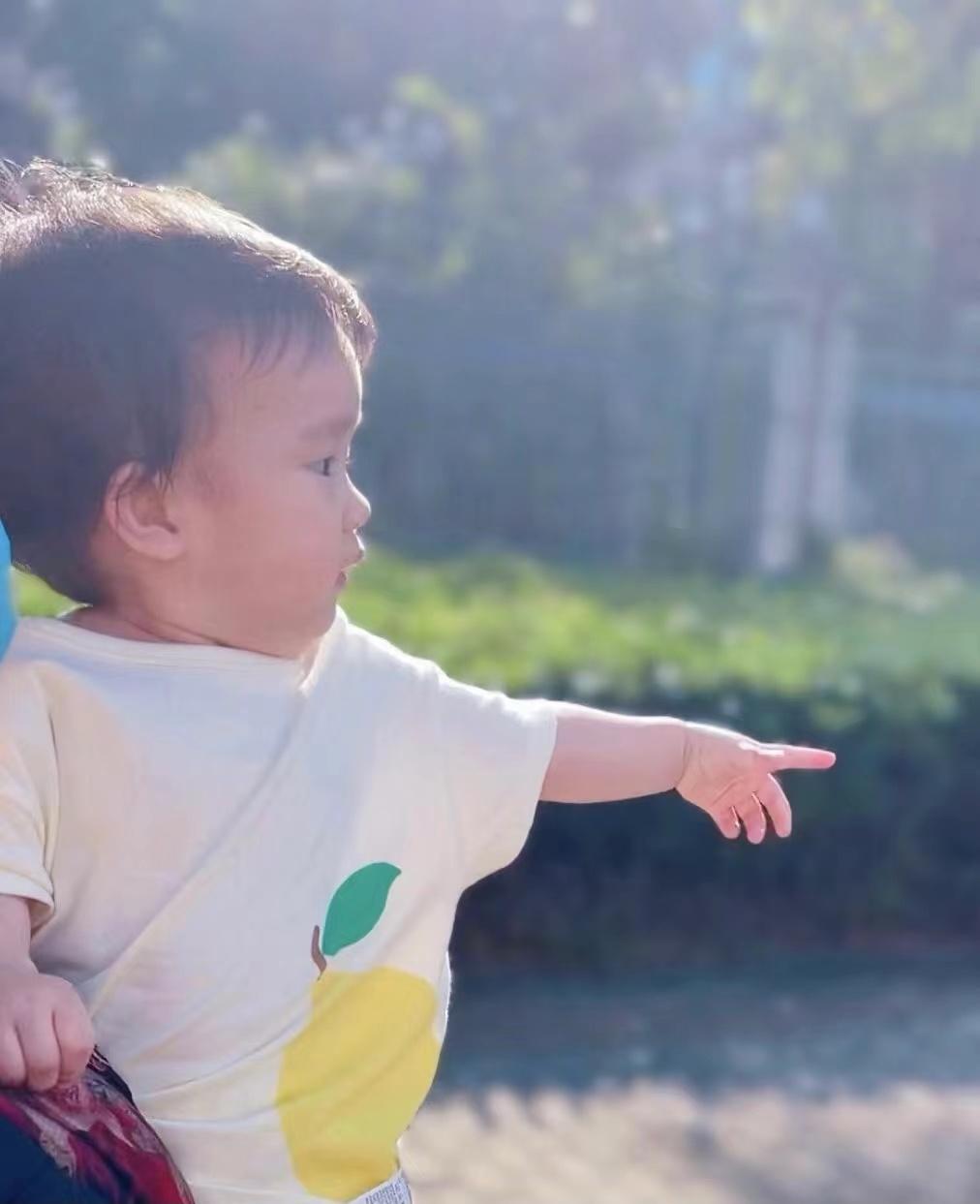 你在教孩子什麼是花花草草時,要蹲下來,看着孩子的眼睛,然後用手指向你說的花花草草。