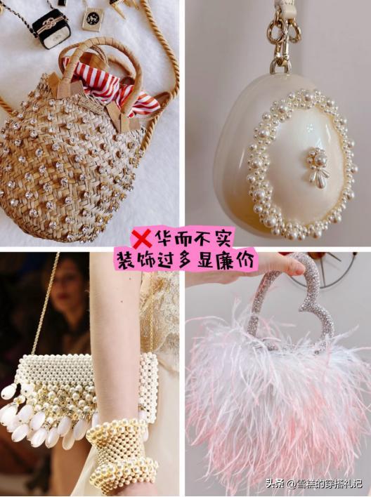 年輕的時候,總是對這種顏值高的包包毫無抵抗力,加入各種珍珠、水鑽、羽毛元素,背在身上出片率特別高,可背不了幾次,就會讓人審美疲勞,作爲日常搭配,存在很多隱形的“硬傷”。