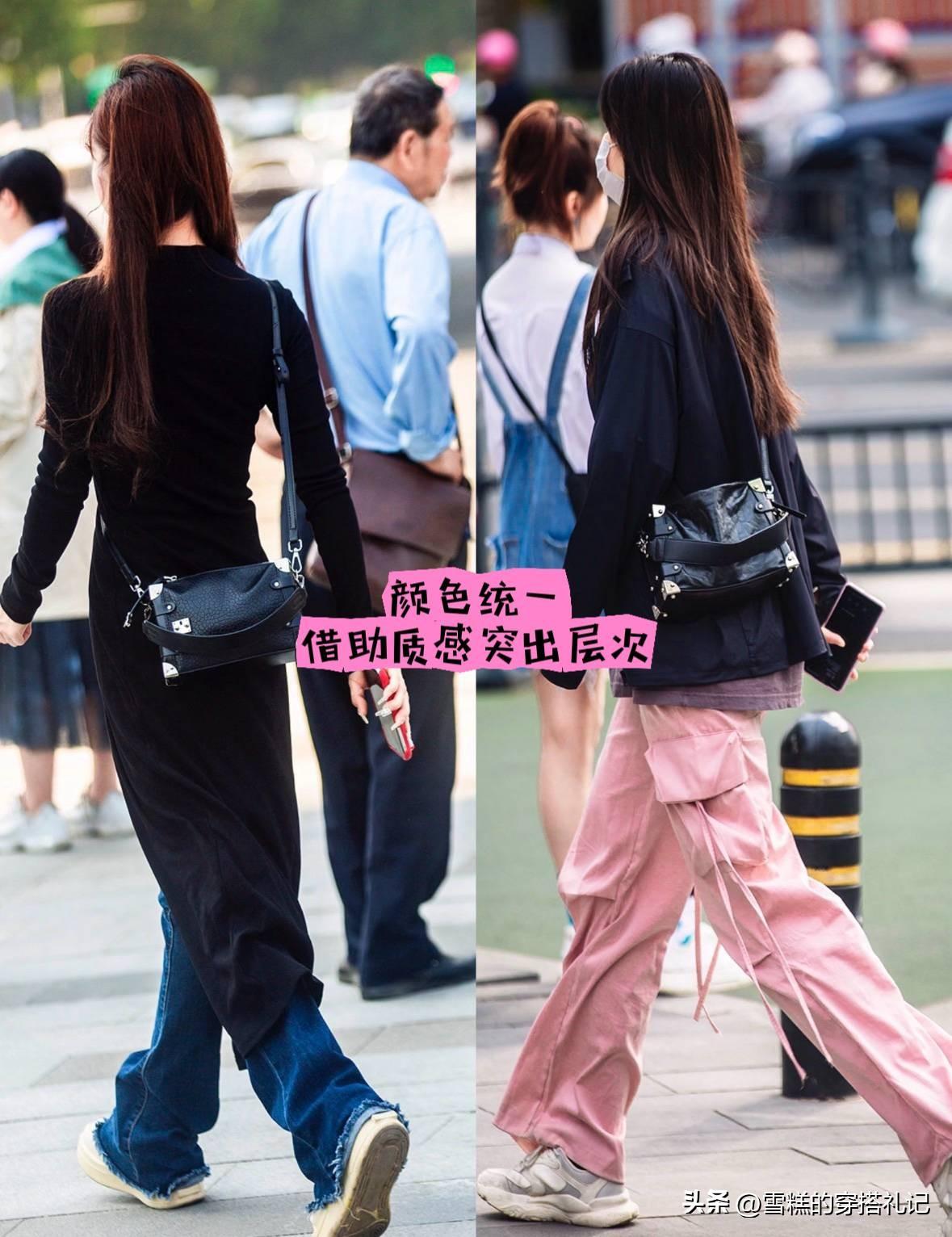 穿衣打扮講究一個整體性,所以即便是搭配包包,我們也要圍繞穿搭而定,選擇一隻和衣服同色的包包,質感有對比,照樣可以突出層次。