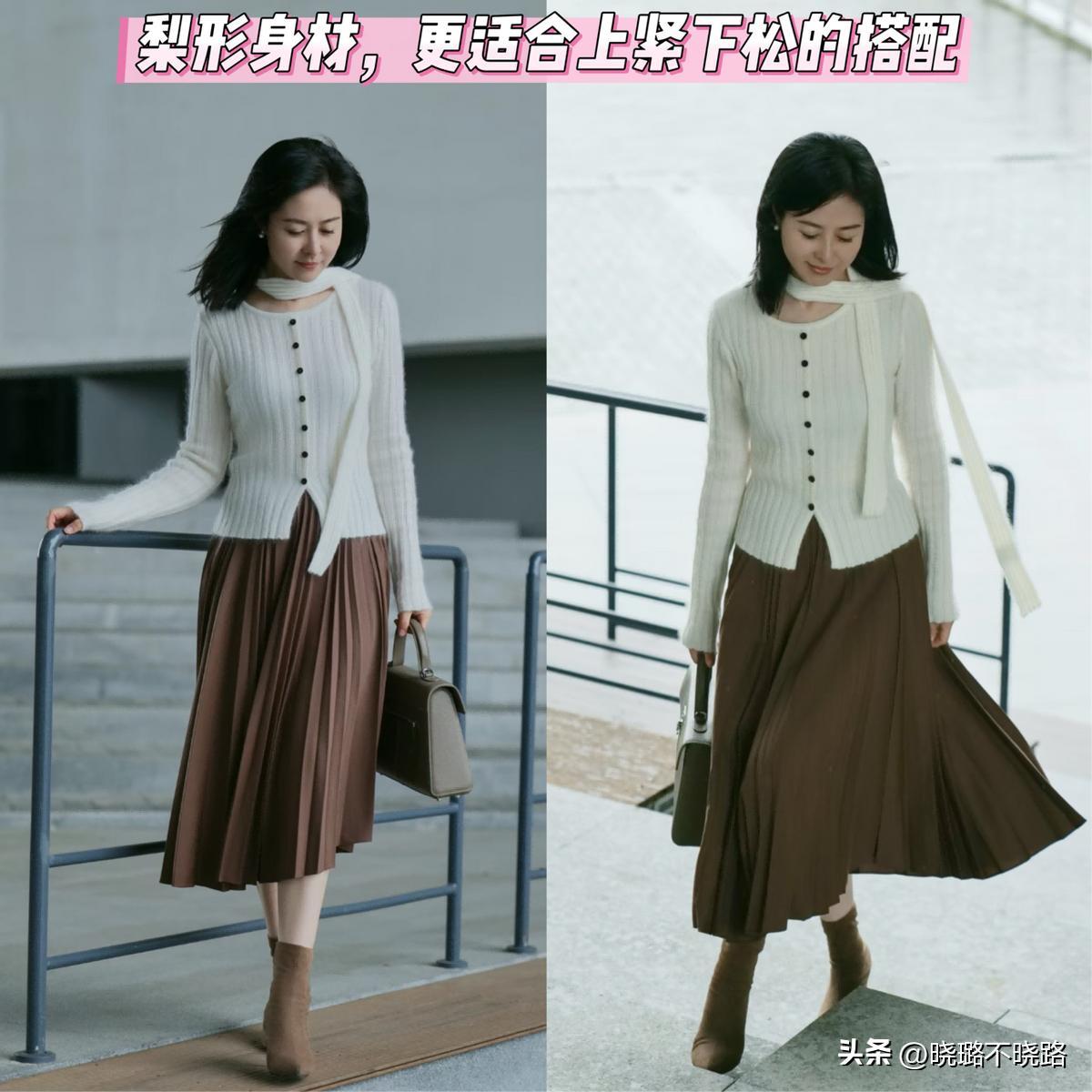 比如說你的身材狀態是屬於比較典型的梨形身材,或者是下半部分的腿型比較粗壯的話,那麼其實這樣的組合單品就更加的適合呈現上緊下松的效果。上半部分的單品,我們可以優先於選擇比較貼合於我們身形狀態,又或者是直筒的版型狀態,下半部分的褲裝和裙裝就是寬鬆的設計,但是這兩種單品所呈現出來的輪廓感都是很明朗清晰的。