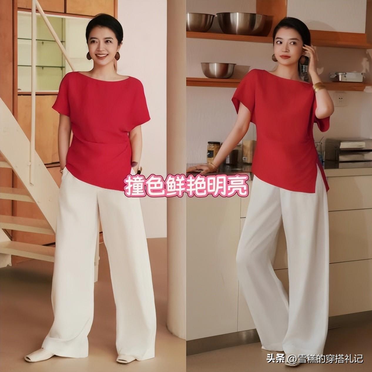 最經典的配色,往往最考驗功力。紅色的高飽和度和白色的包容度是恰到好處的中和,顏色對比分明,乾淨利落。將紅色放在上半身收縮視覺,白色放在下半身提亮整體。頭上選擇一頂禮帽作爲裝飾,增加層次感和慵懶感。白色拼色鞋履,呼應整體造型。